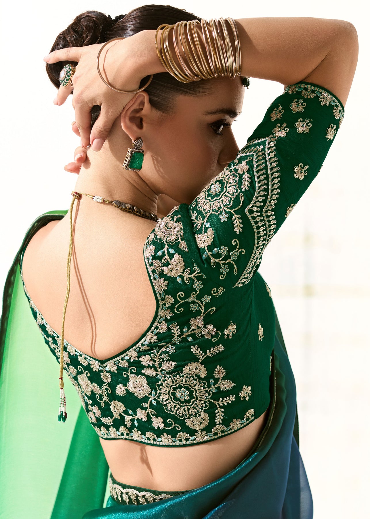 This luxurious saree features a sheer, shimmering pine green organza‑tissue silk blend, exuding timeless elegance with every drape. Its dramatic, intricately embroidered heavy border adds striking contrast and visual depth, making it perfect for festive and evening occasions. Paired with a thoughtfully crafted designer blouse in complementary silk blend, it offers a refined, cohesive look that’s both graceful and statement‑worthy, this saree delivers both the traditional charm and the ethereal texture of modern textile artistry, ideal for memorable ensembles.