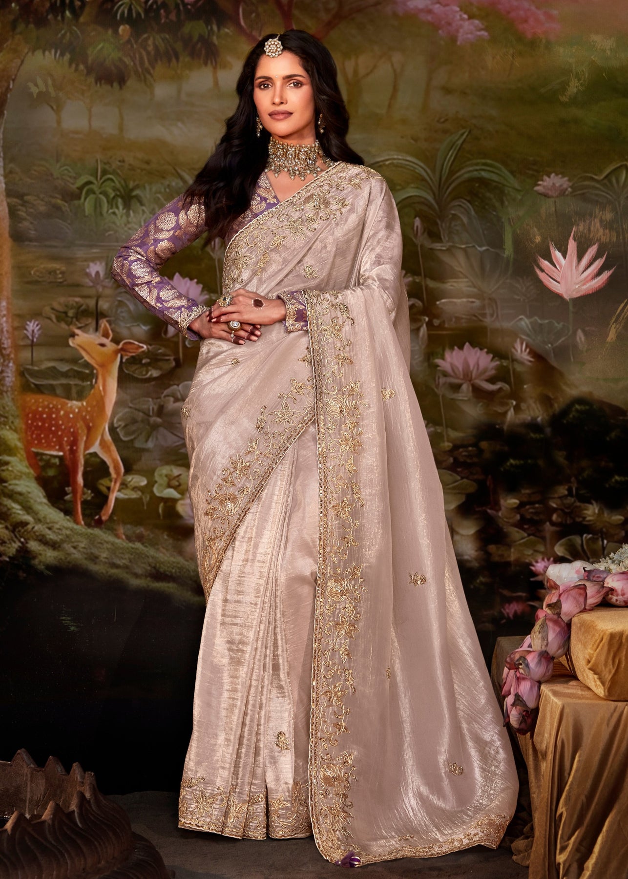 Purple And Cream Saree With Embroidery And Handwork Designer Cut Border