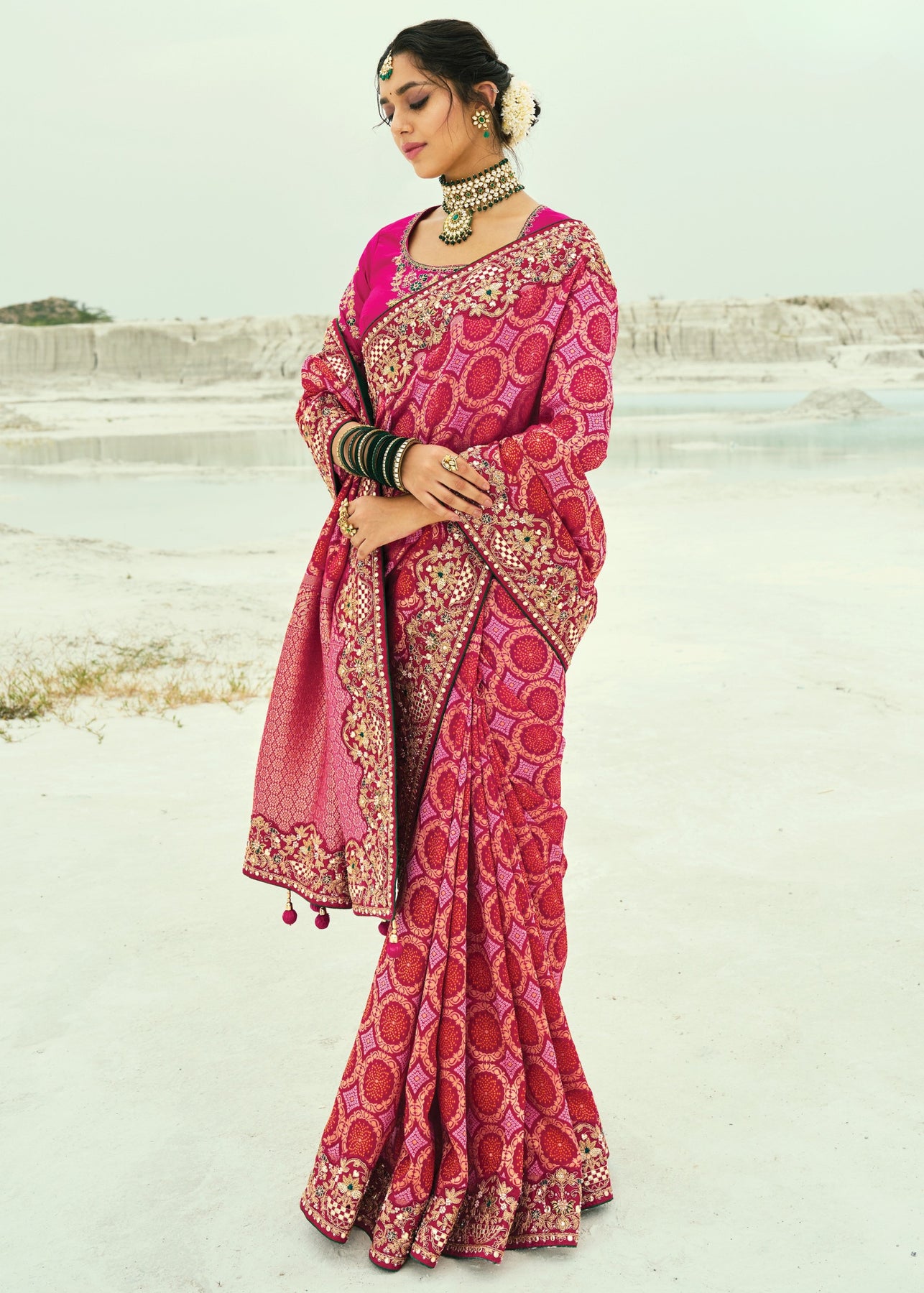Rani Pink Georgette Bandhej Saree With Moti & Cut-Dana Handwork Border