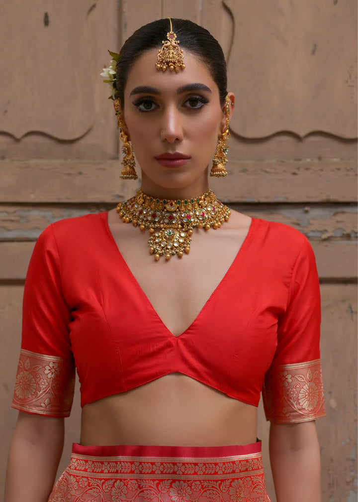 The Red Leriya Zari Woven Saree with Contrast Pallu is a stunning piece that embodies traditional Indian craftsmanship. This saree is crafted from luxurious silk and features intricate zari weaving throughout, enhancing its opulent appeal. The vibrant red hue is complemented by a contrasting pallu, adding a striking visual element to the ensemble. The saree is accompanied by an unstitched blouse piece, allowing for customization to your preferred style. Ideal for festive occasions, weddings, and cultural events, this saree offers both elegance and comfort.