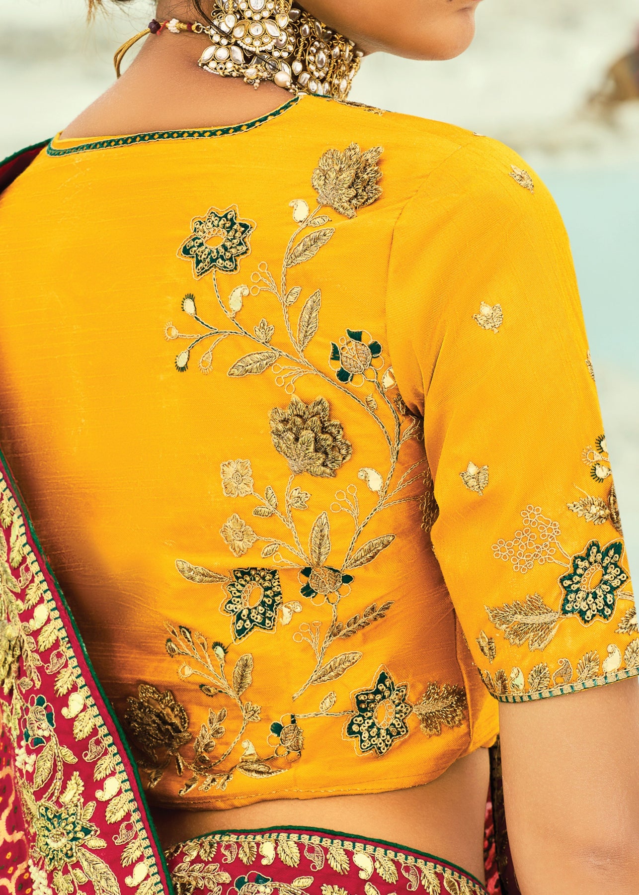 This radiant georgette saree fuses vibrant yellow and orange hues with the timeless charm of traditional Bandhej .Rich Moti and Cut-Dana handwork embellishes the border, adding dimensional elegance and artisanal flair. Crafted with blended georgette fabric and paired with both plain and embroidered blended silk blouse pieces, it strikes a perfect balance between craftsmanship and comfort, it’s an exquisite choice for festive and celebratory occasions.