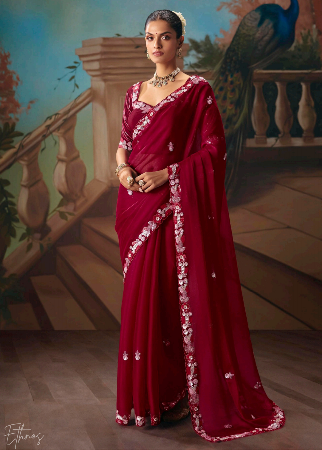 Crimson Red Sequins Organza Saree