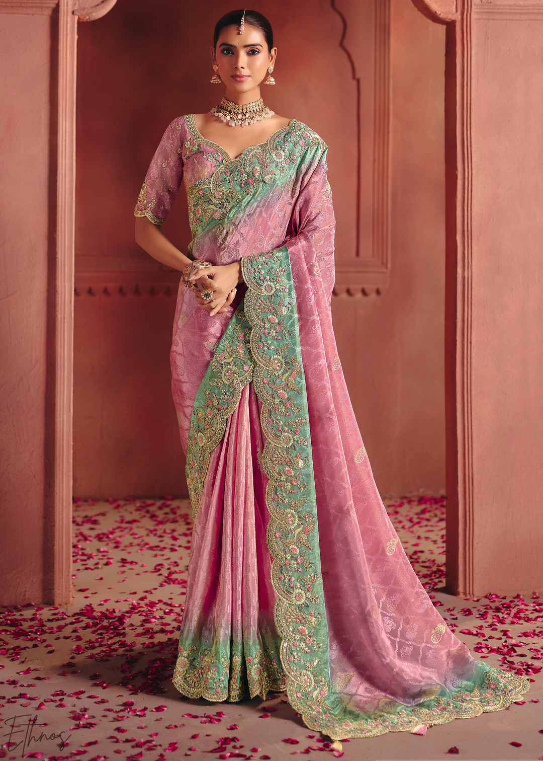 Dusky Pink Floral Resham Silk Saree
