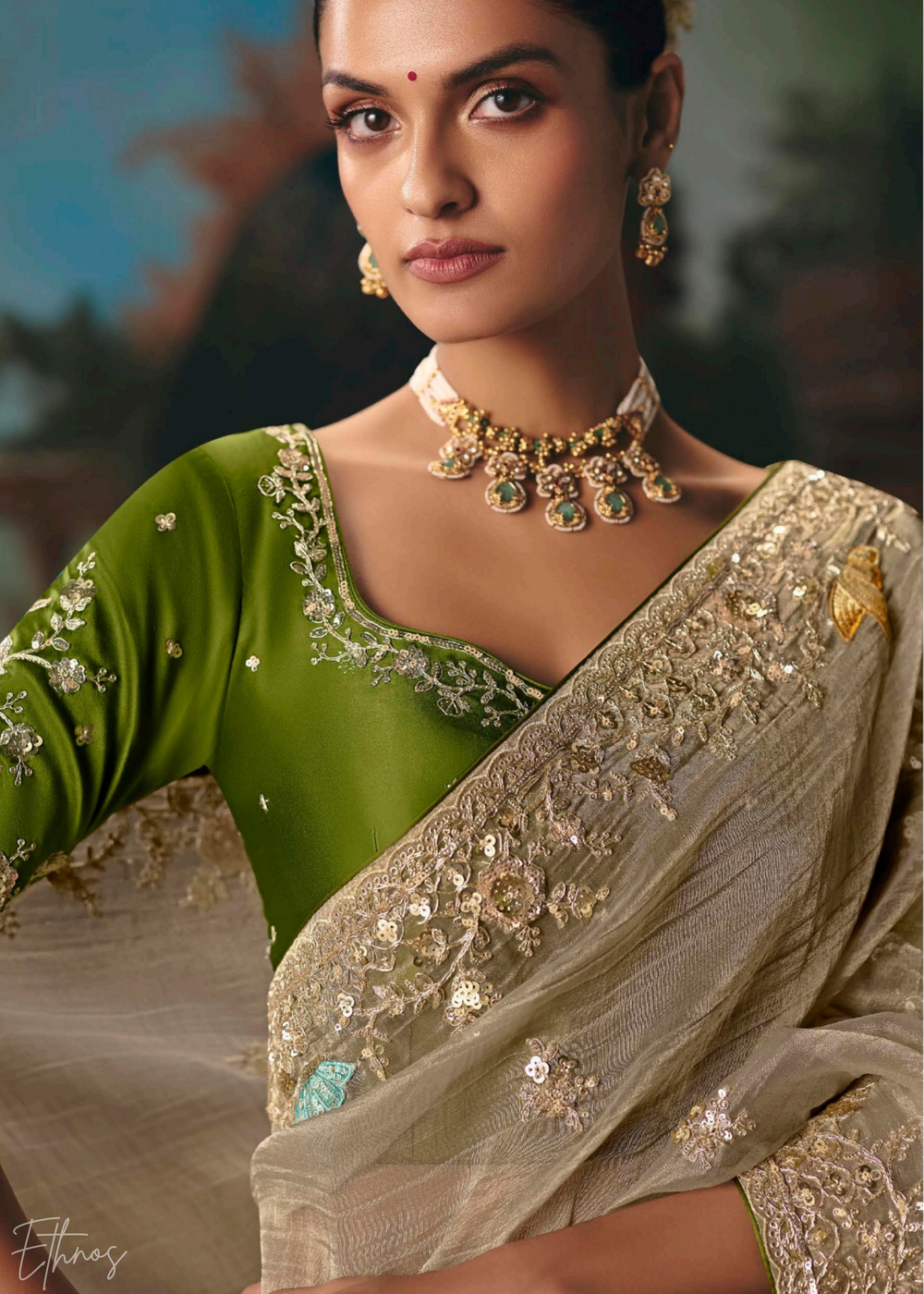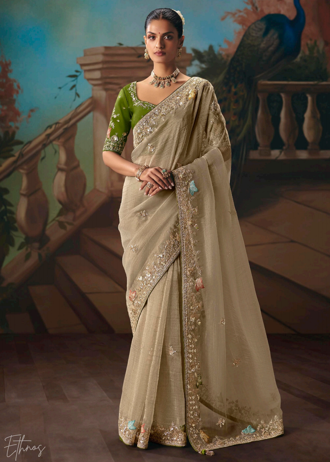 Cream Serene Forest Silk Saree