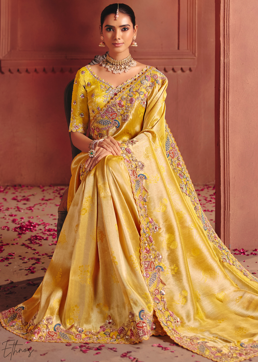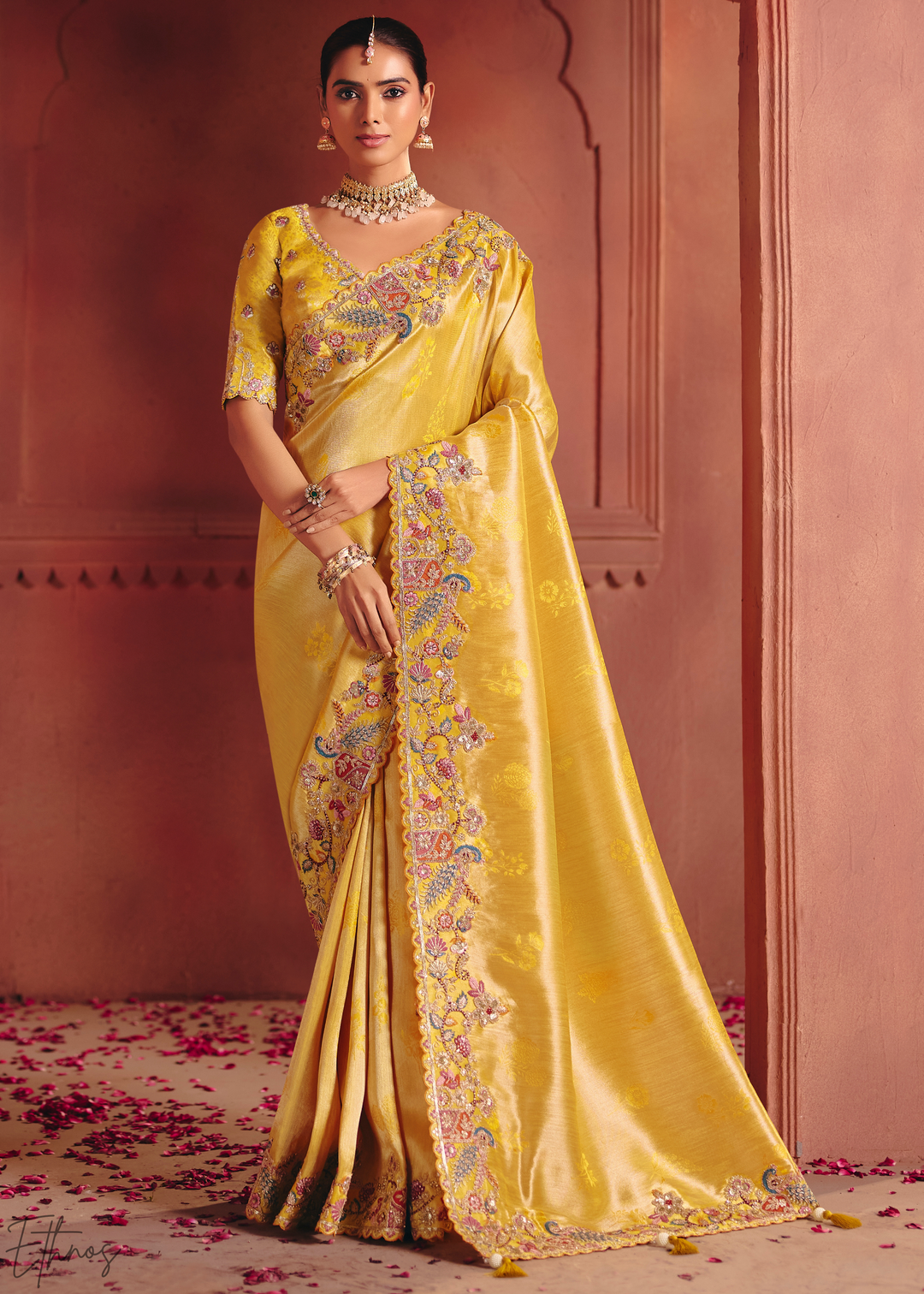 Golden Yellow Floral Resham Silk Saree