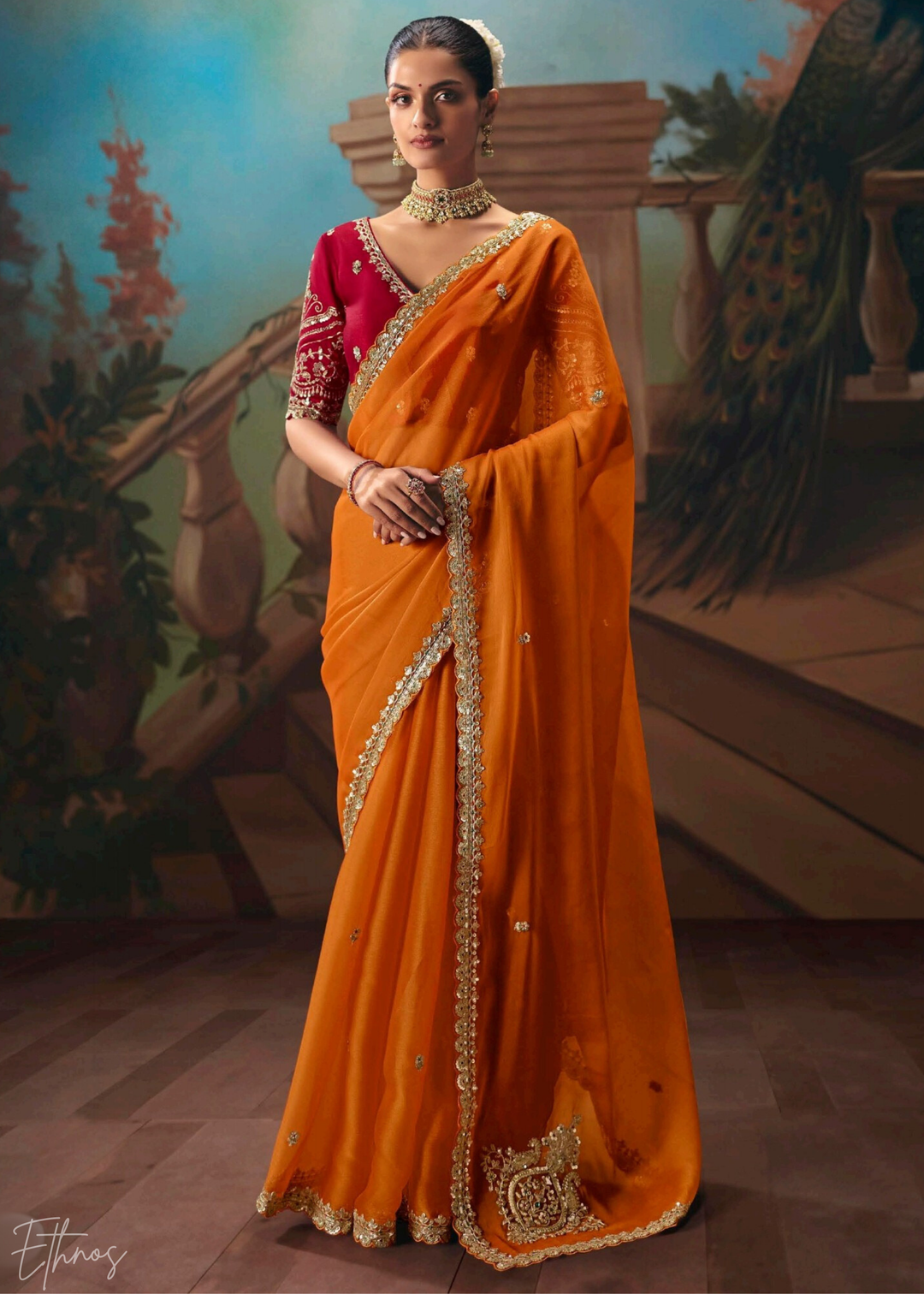 Orange Floral Silk Saree