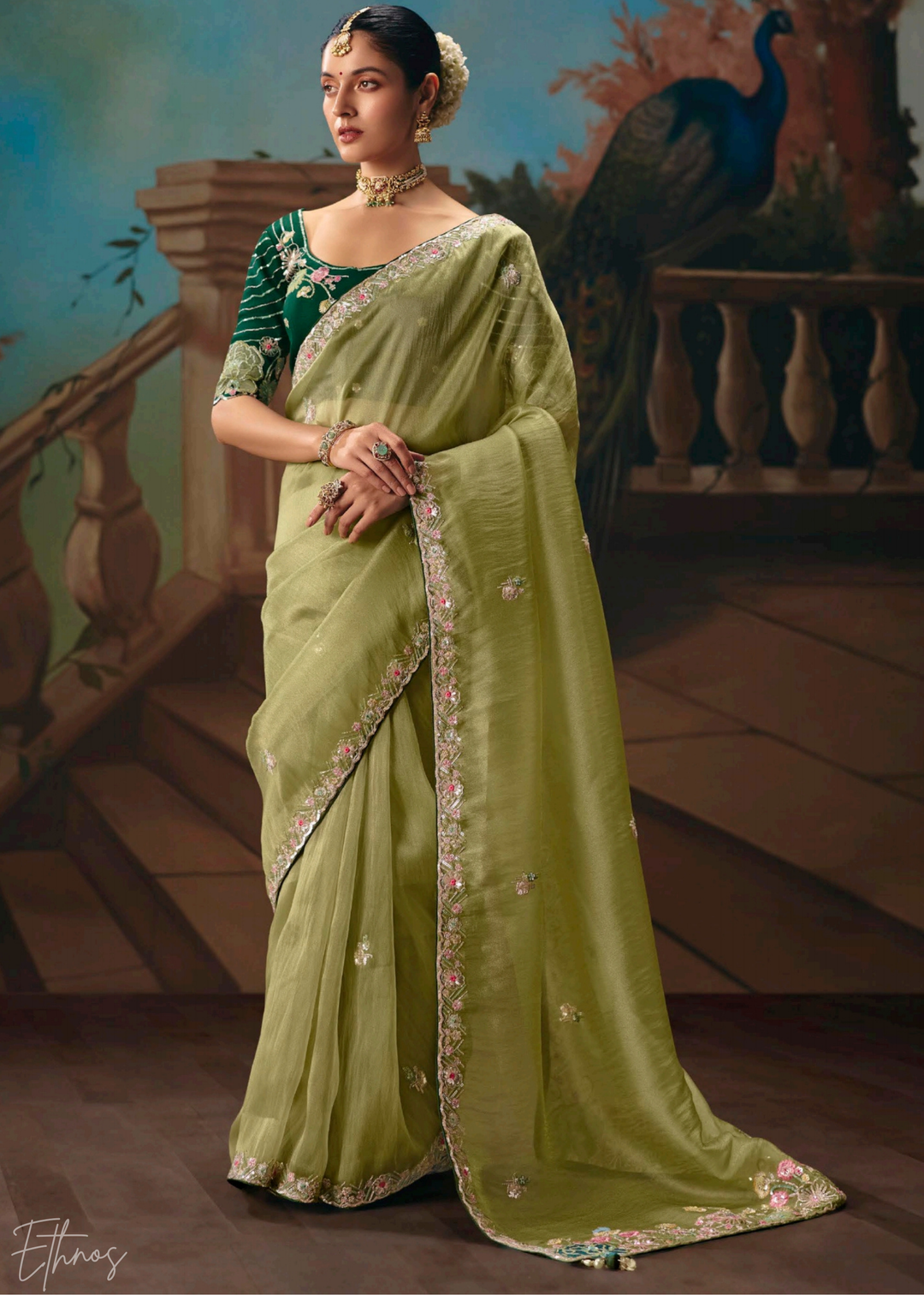 Pistachio Green Floral Resham Silk Saree