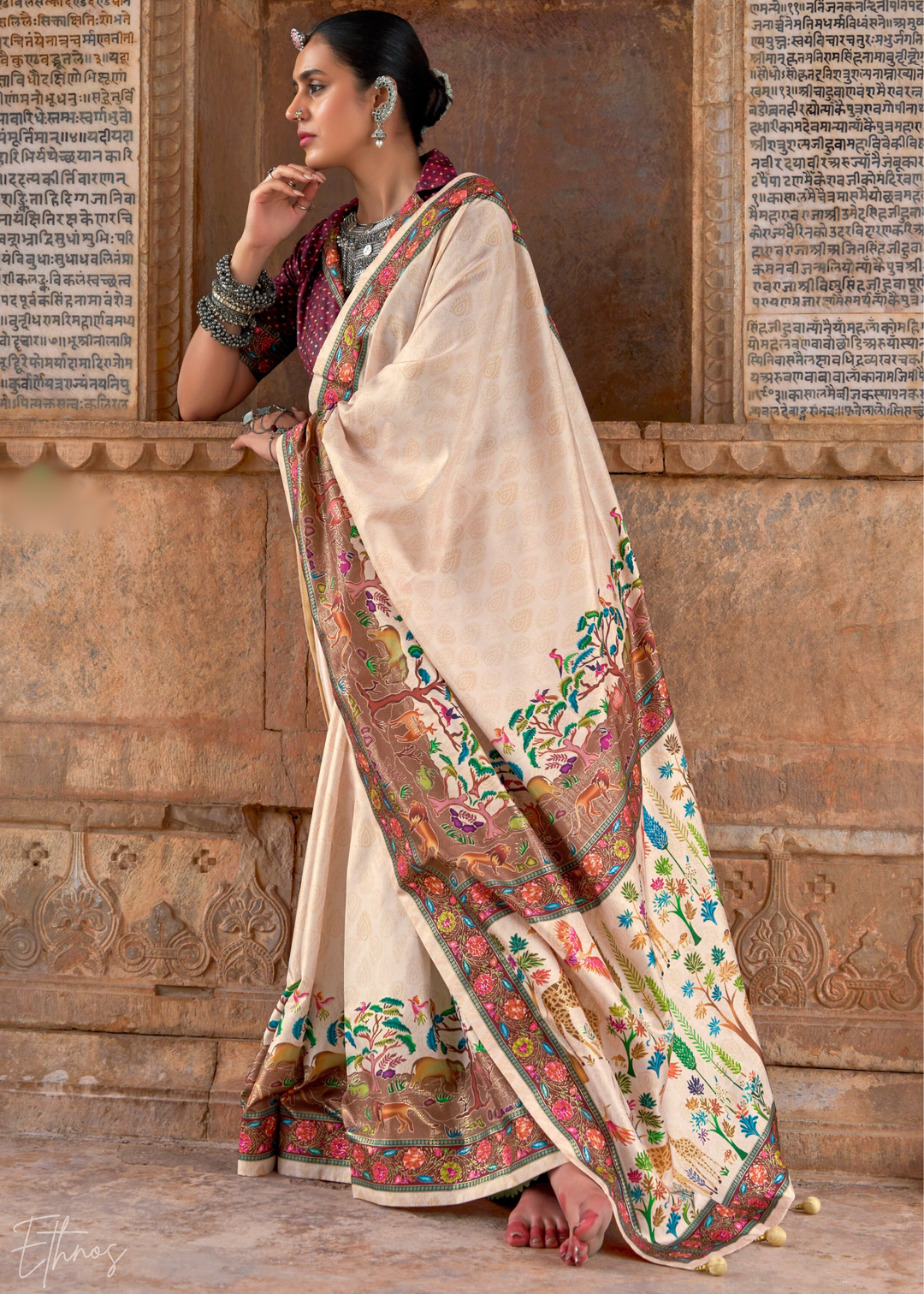 Cream Kashmiri Silk Saree