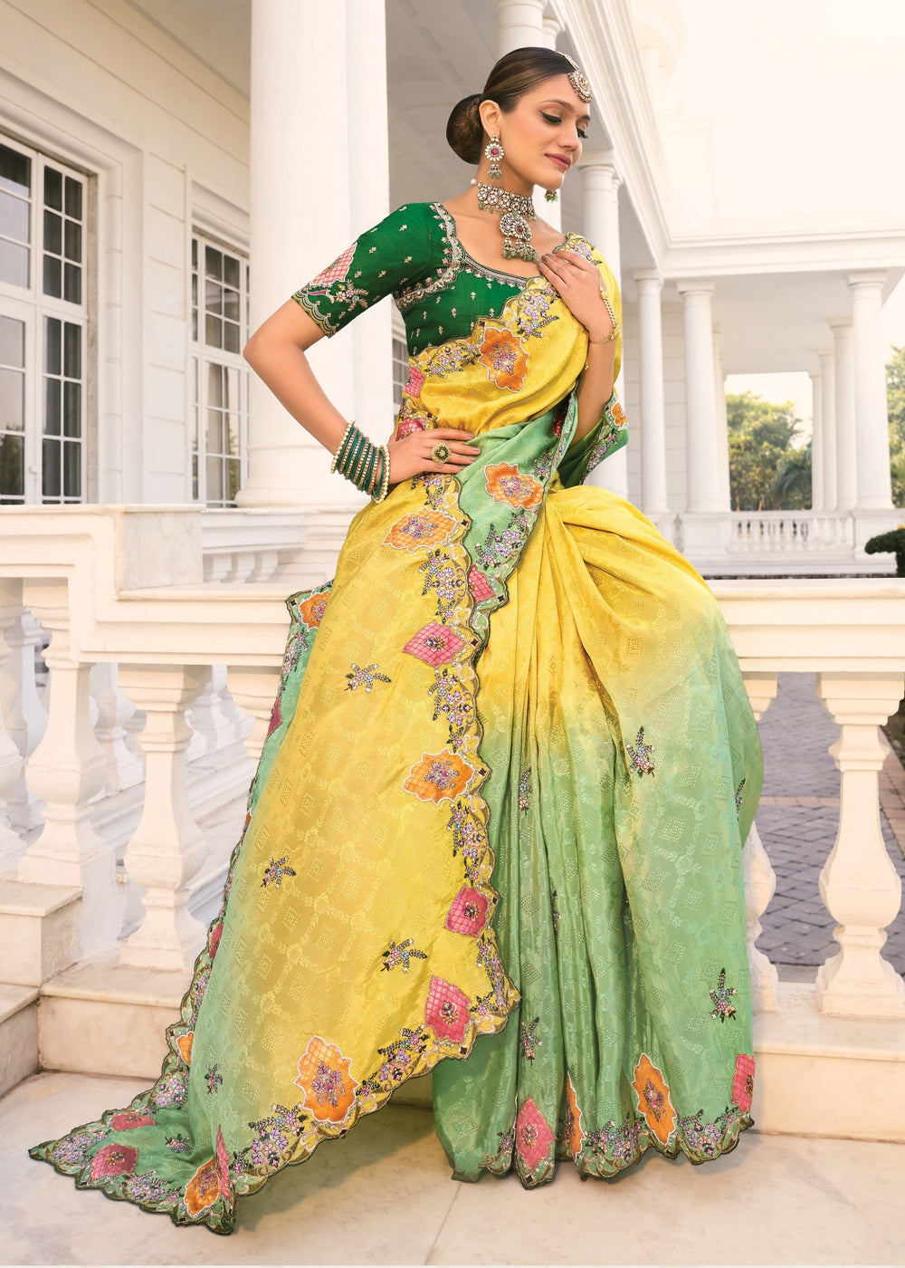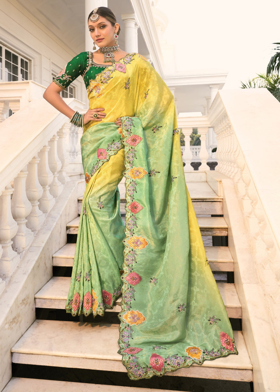 Lemon - Green Natural Crape Jaquard Saree With Jari Work