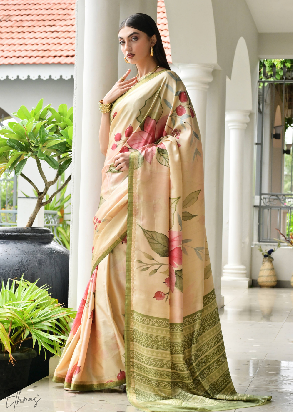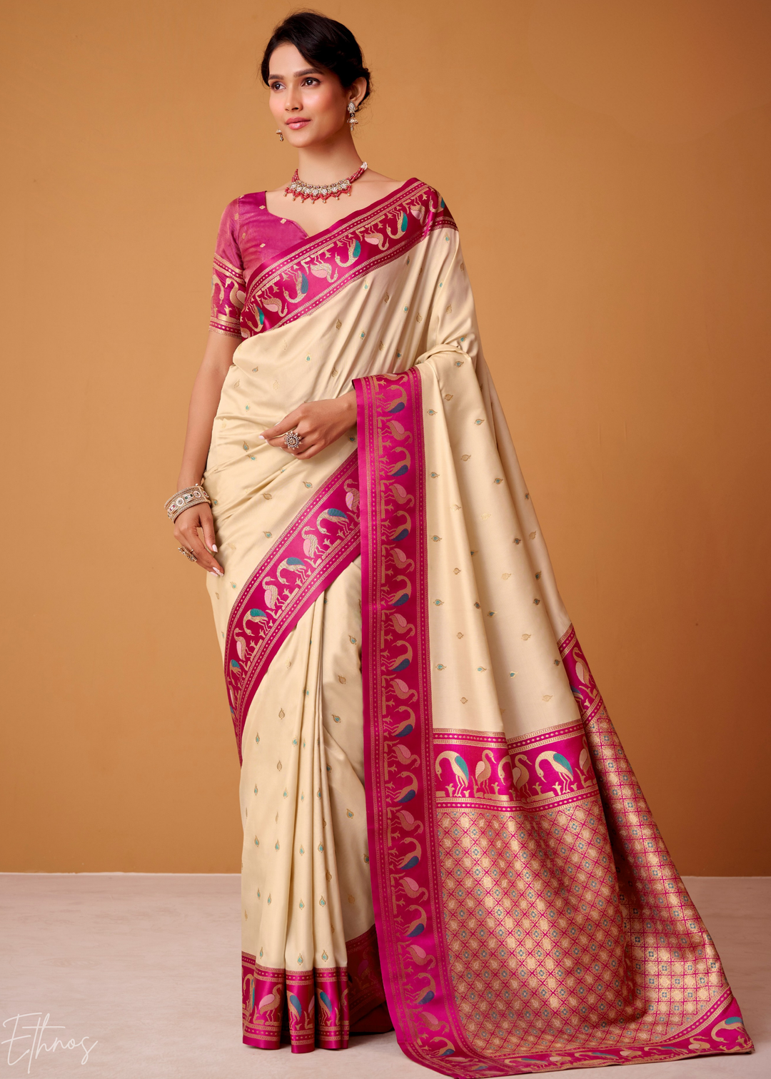 Cream Flamingo Satin Silk Saree