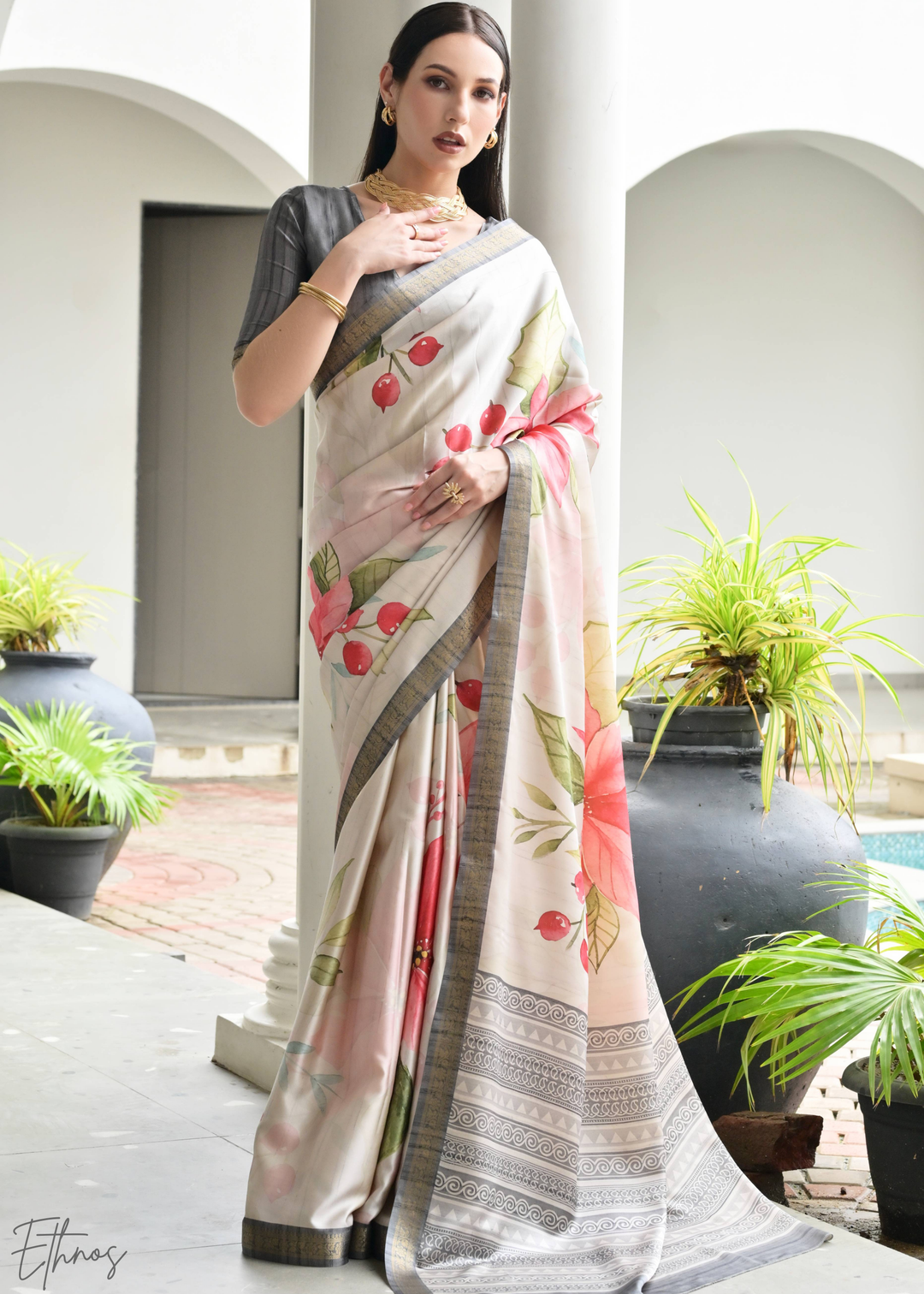 Grey Floral Zari Satin Silk Saree