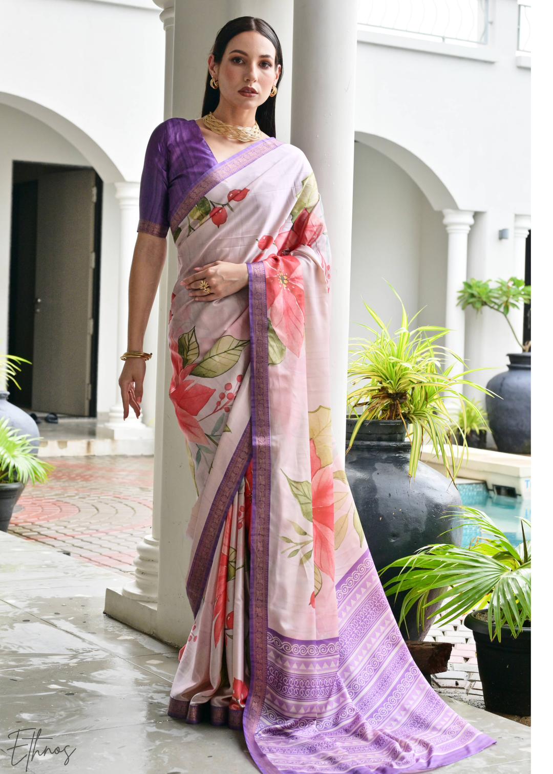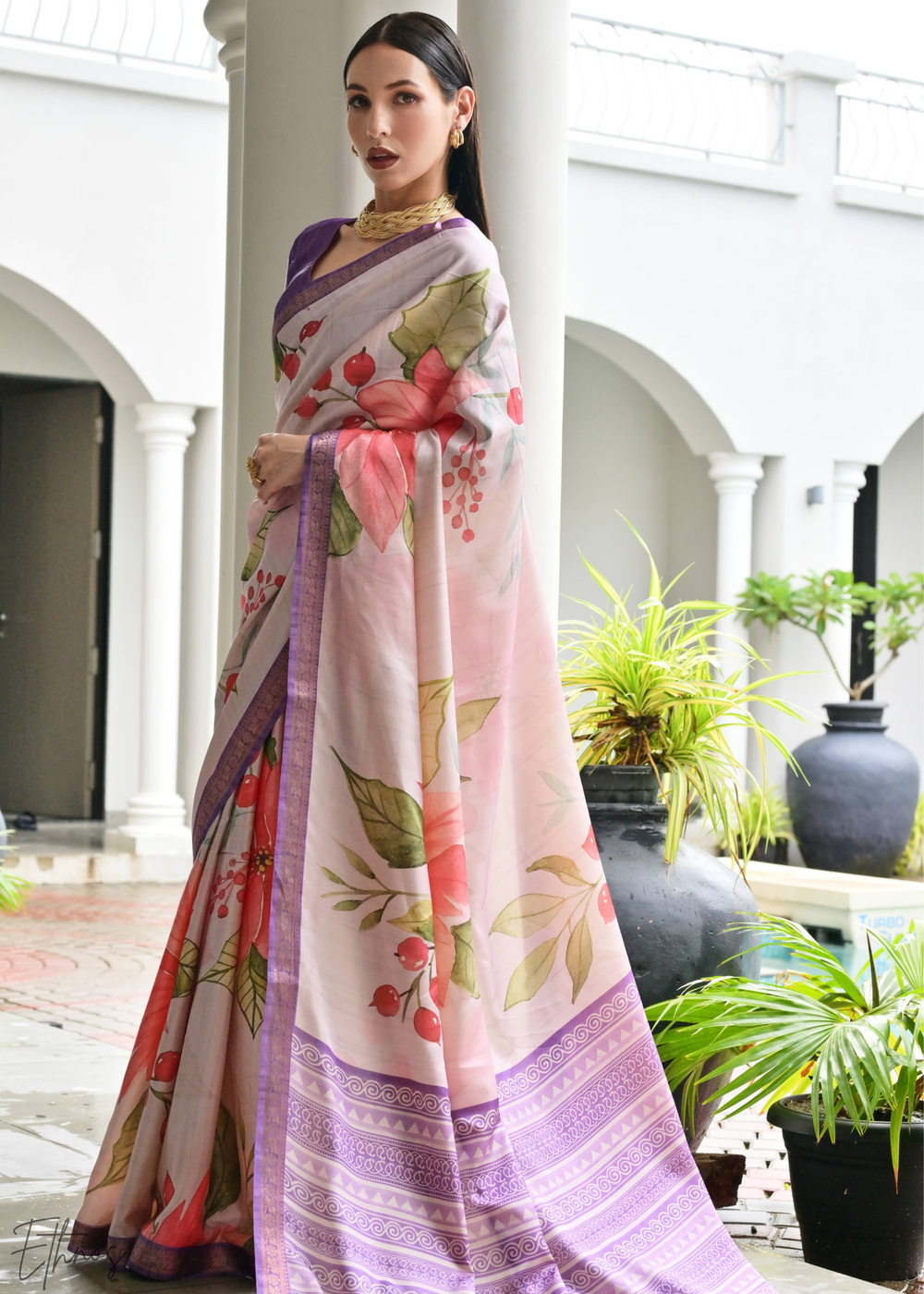 Lavender Floral Zari Satin Silk Saree