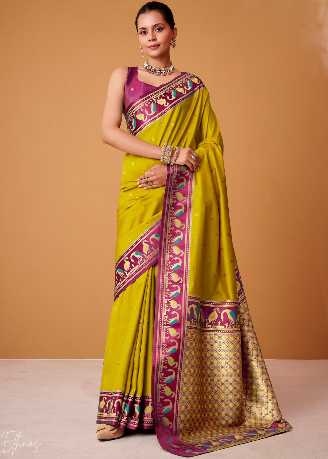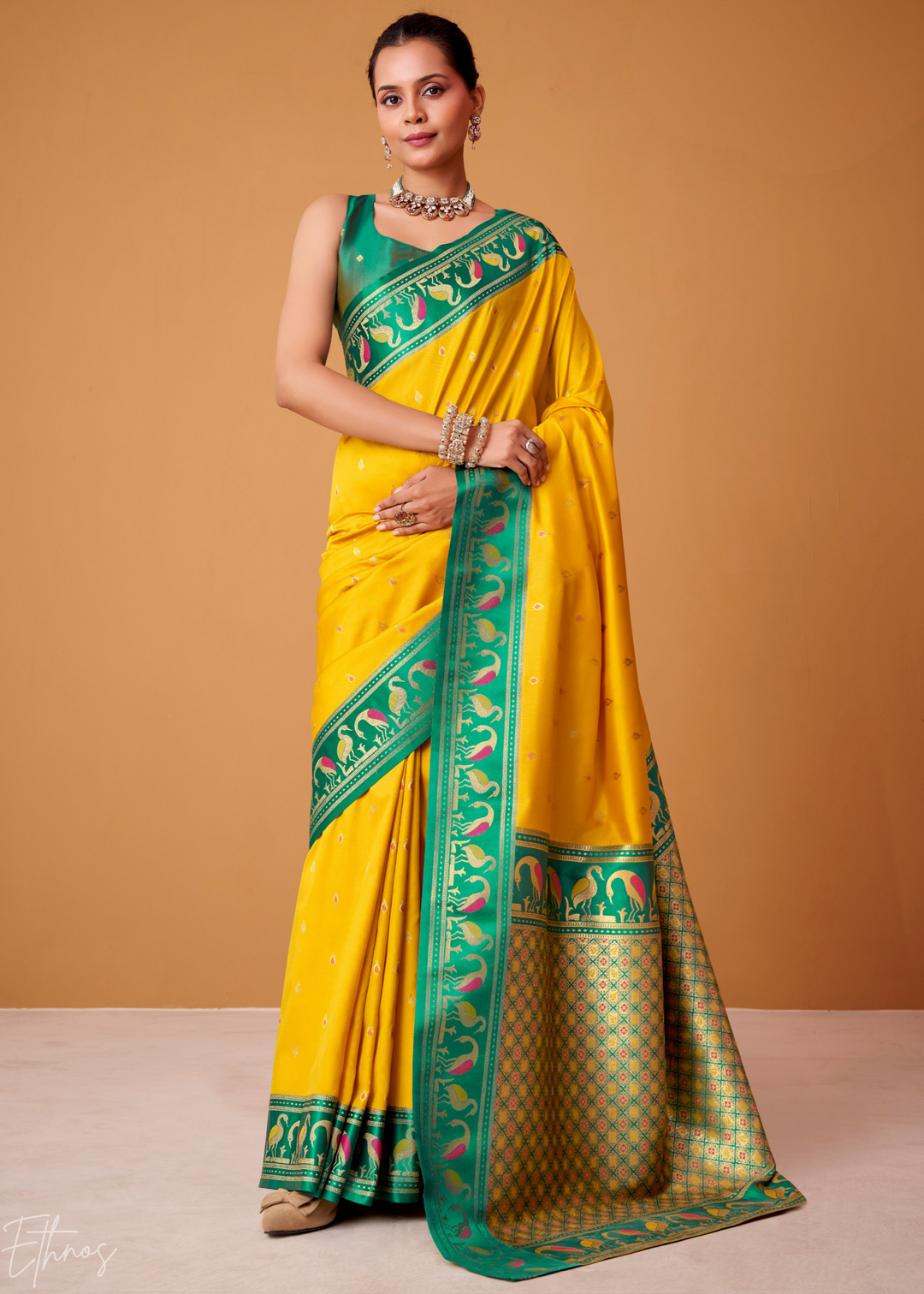 Mustard Yellow Flamingo Satin Silk Saree