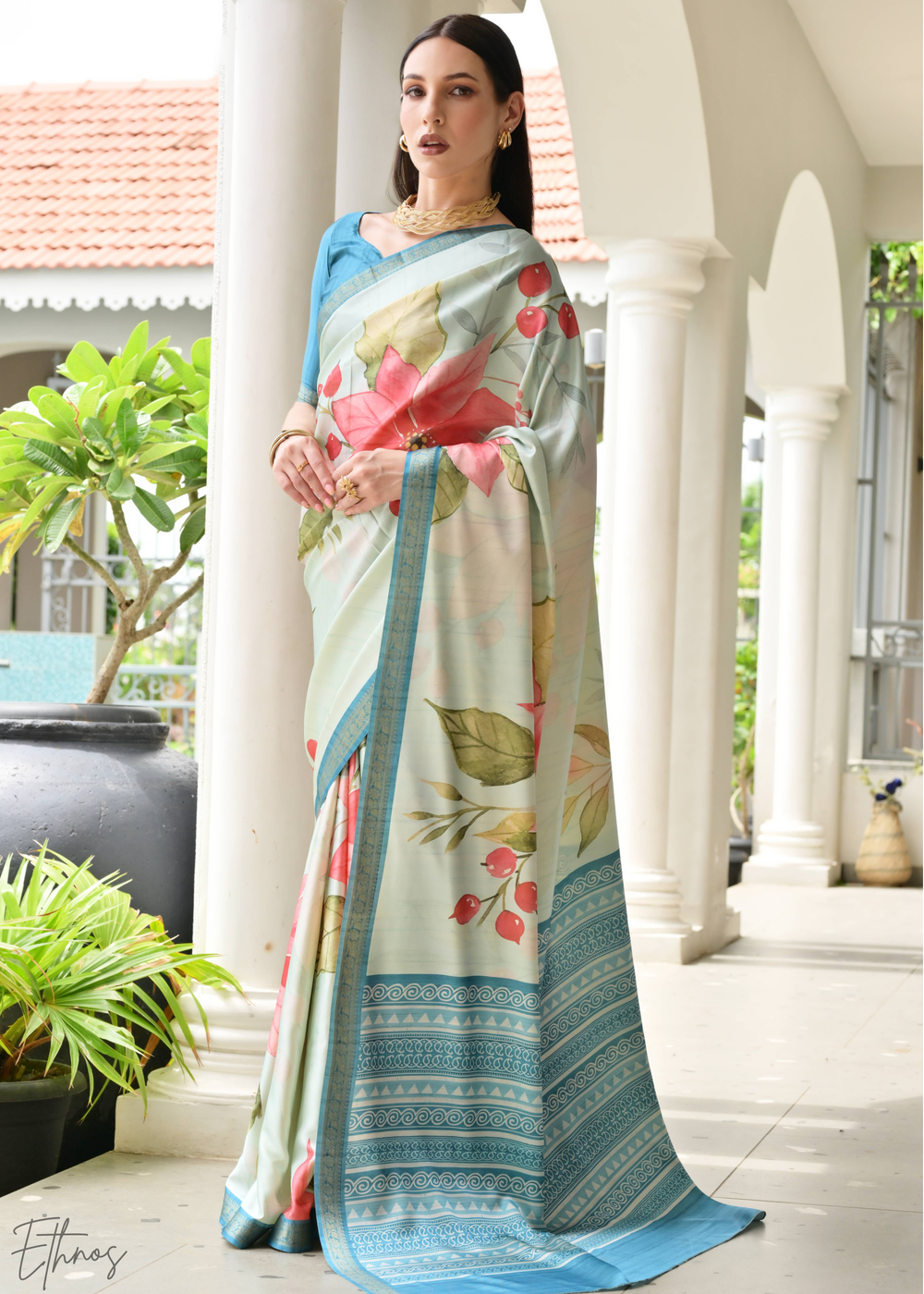 Teal Blue Flamingo Satin Silk Saree