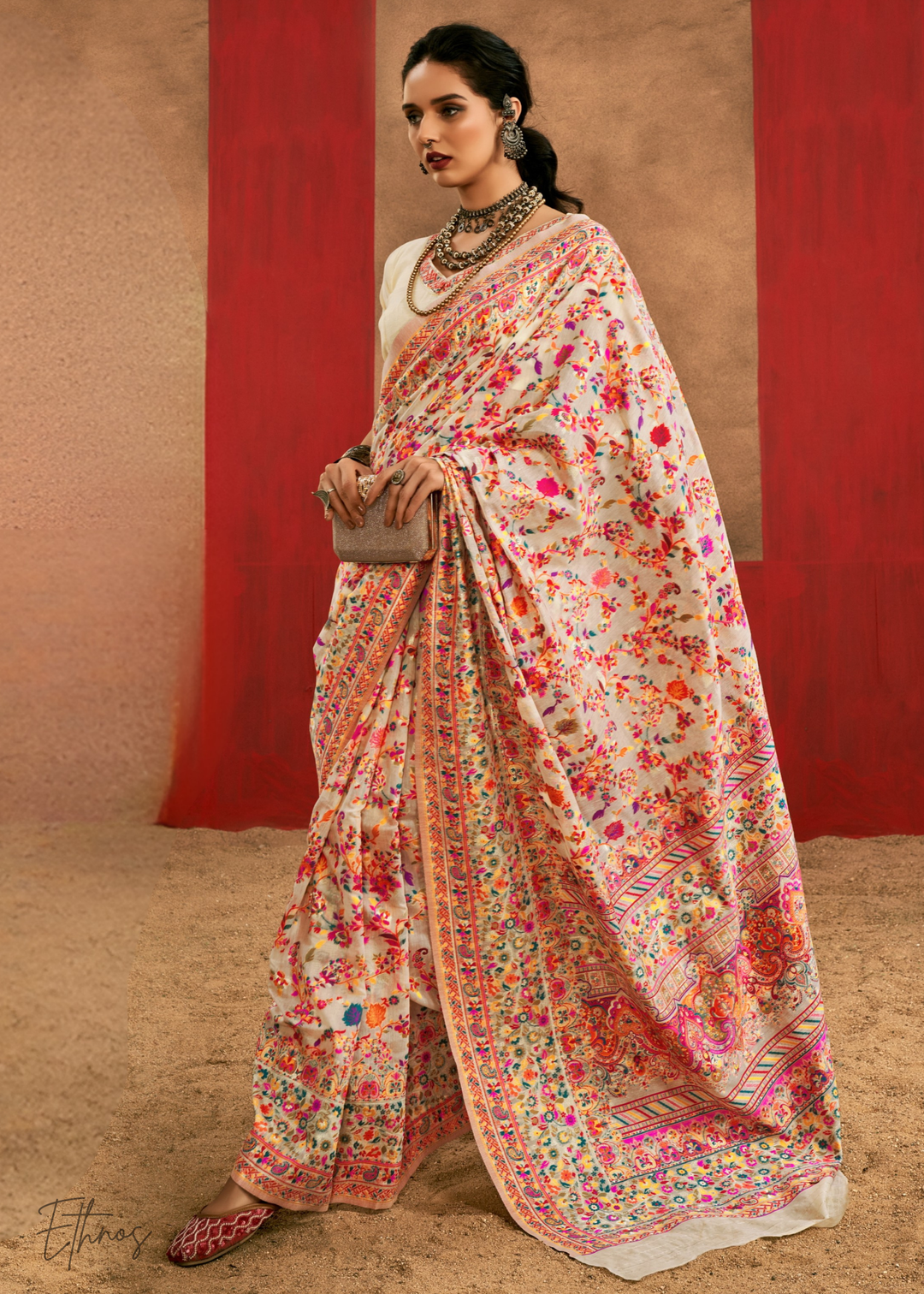 Soft Ivory Peach with Multicolour Kashmiri Floral Weave Saree