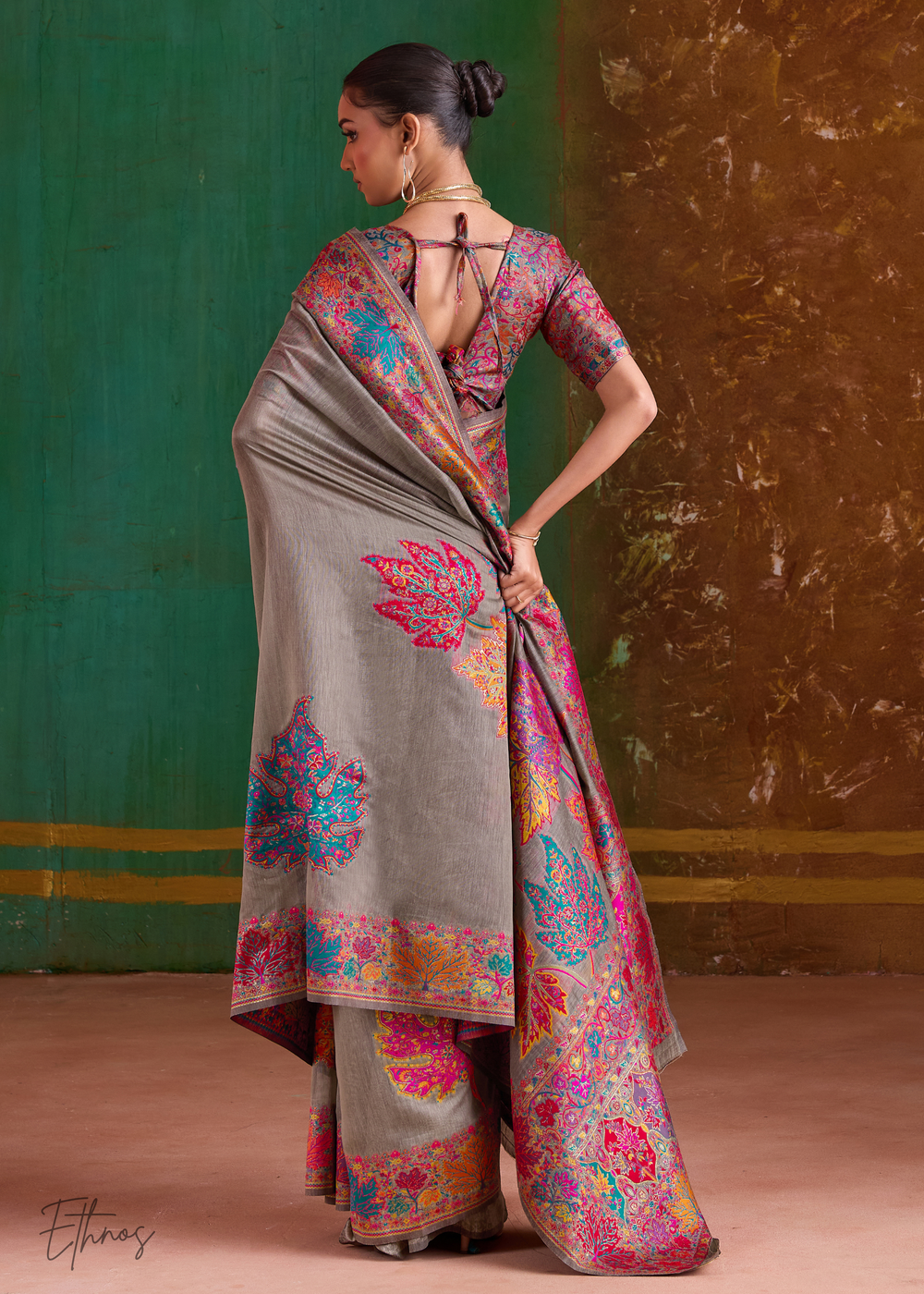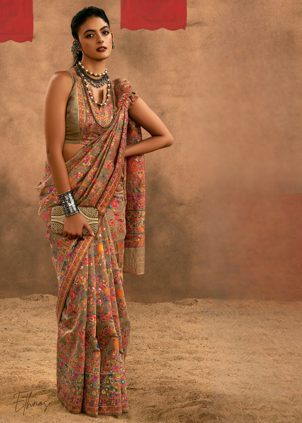 Olive-Taupe with Multicolour Kashmiri Floral Weaving Saree