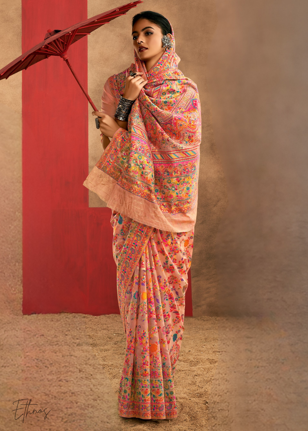 Blush Peach with Multicolour Kashmiri Floral Weave Saree
