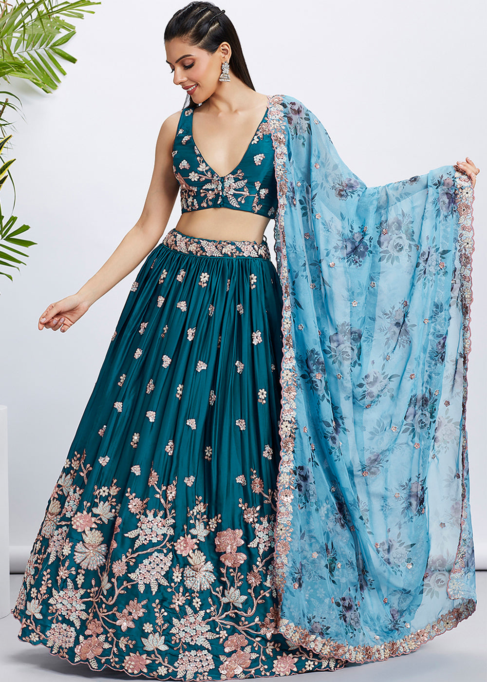 Azure Blue Floral Printed Chinon Silk Lehenga Choli with Sequins & Mirror work