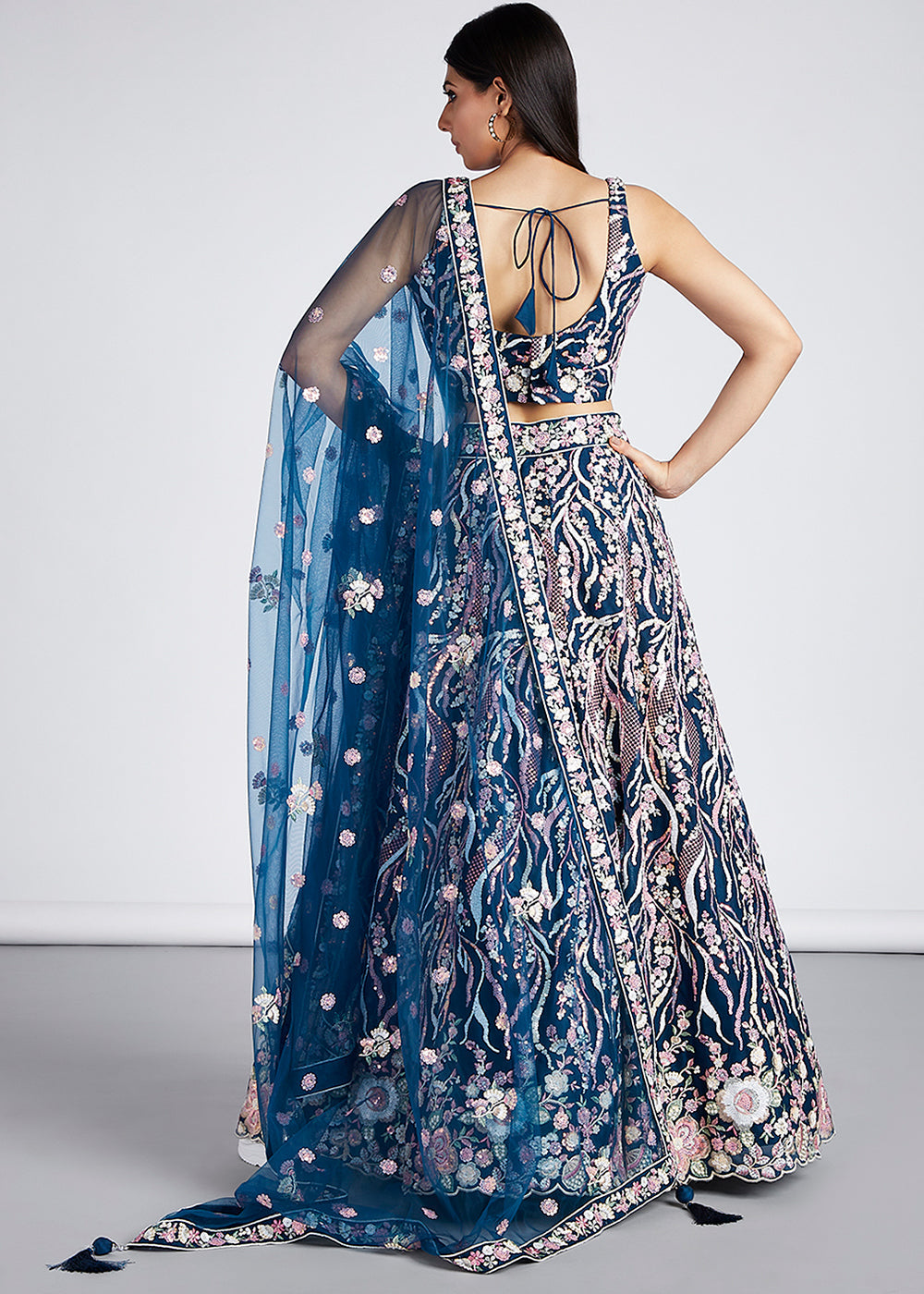 Prussian Blue Soft Net Lehenga Choli with Cording, Stonework, Thread & Zari Embroidery