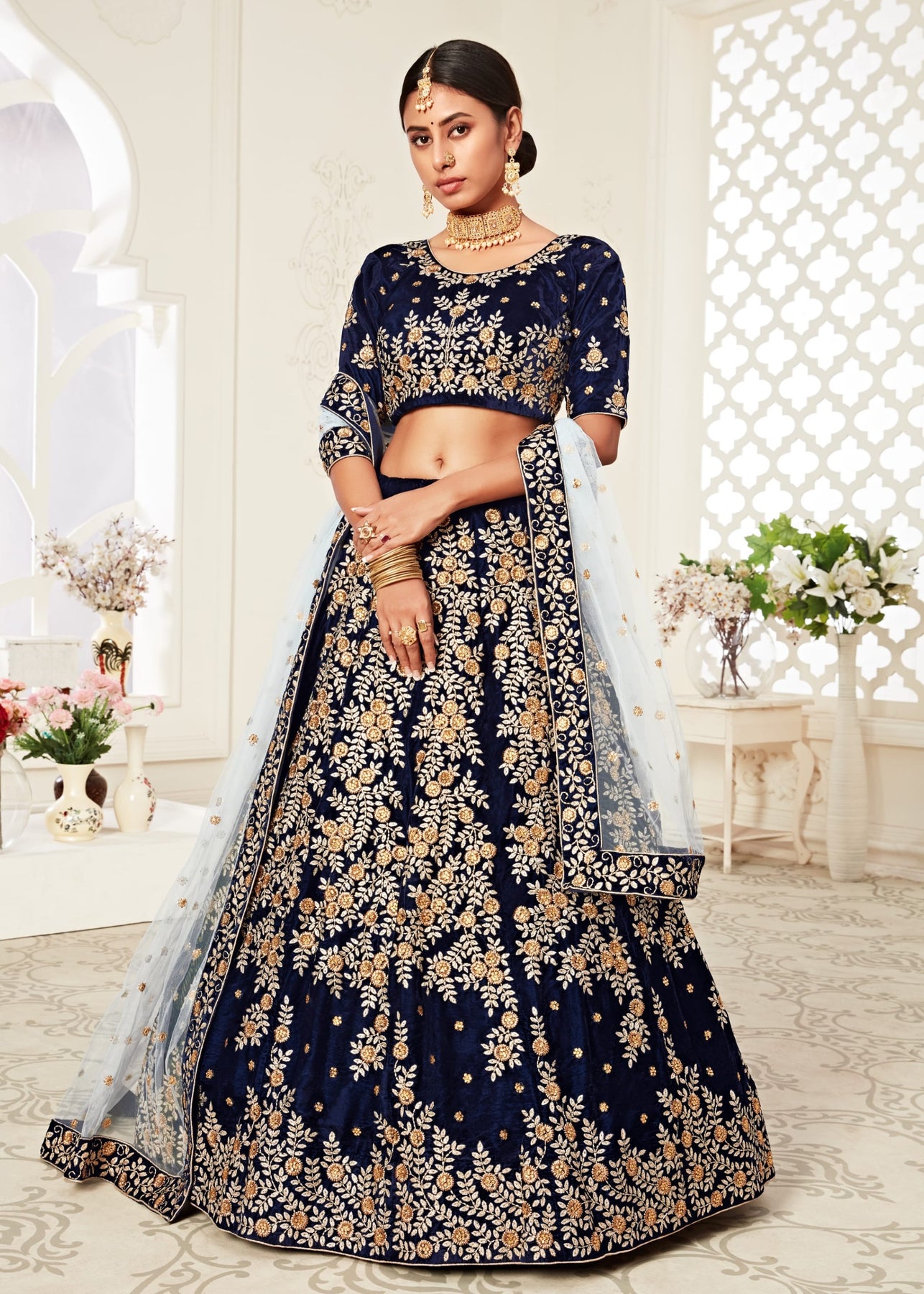 This navy blue velvet lehenga is perfect for weddings, receptions, festive celebrations, and other special occasions where making a statement is desired. Its timeless design and luxurious detailing make it a cherished addition to any wardrobe.
