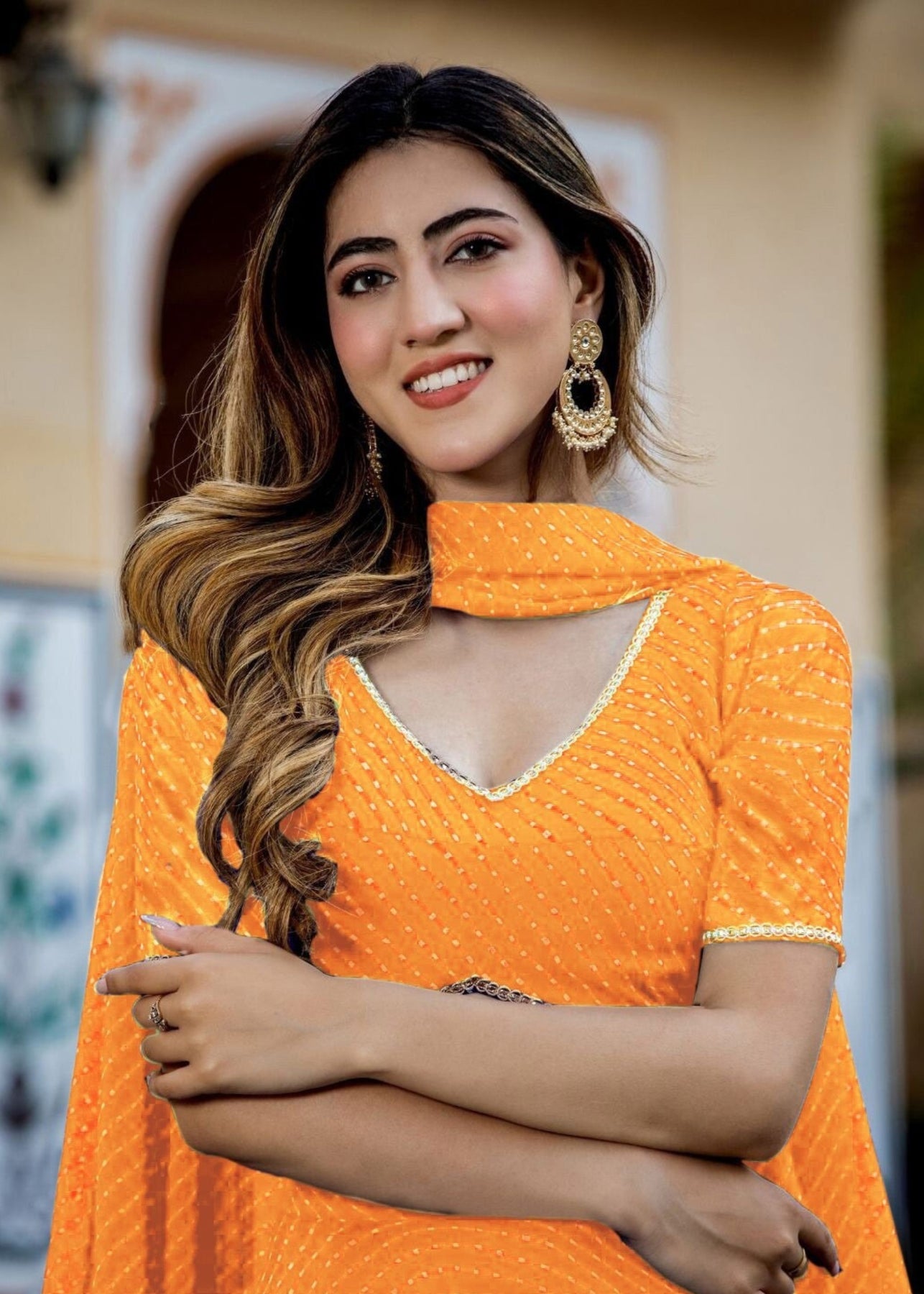 This Tang Orange Georgette Leheriya Print Lehenga is a stunning blend of traditional and contemporary styles. The intricate zari and lace work adds an elegant touch, perfect for festive occasions. The vibrant orange hue and fluid georgette fabric ensure a graceful look. Ideal for those seeking a unique yet sophisticated outfit for weddings or special celebrations.