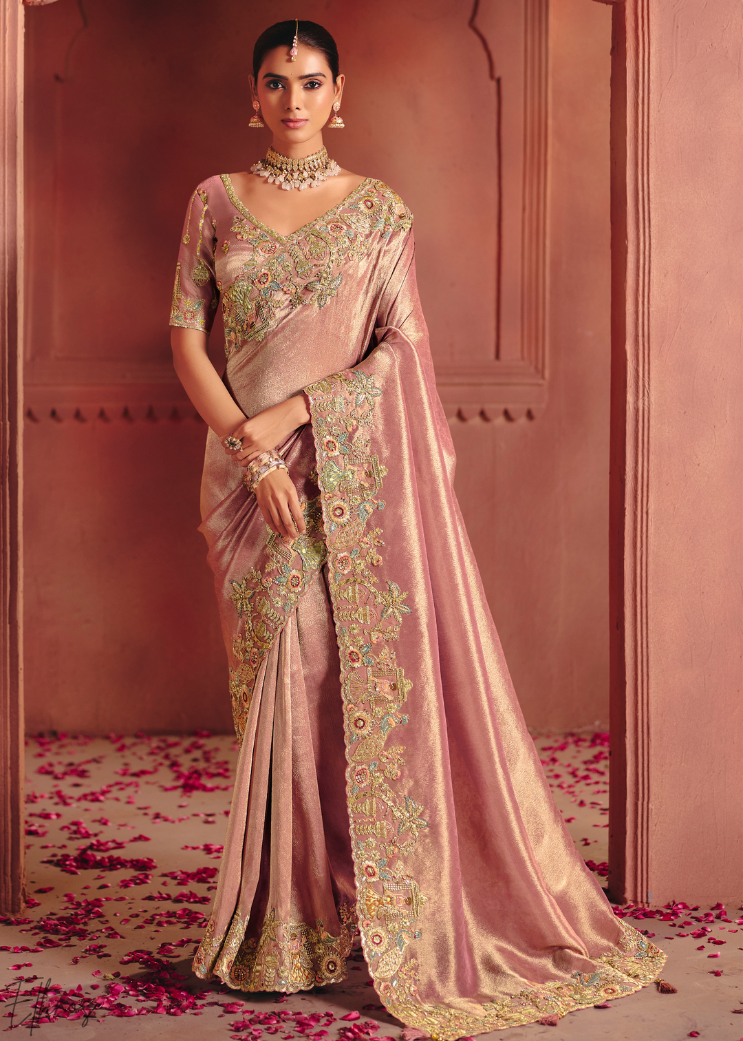 Dusty Peach Floral Resham Zari Silk Saree