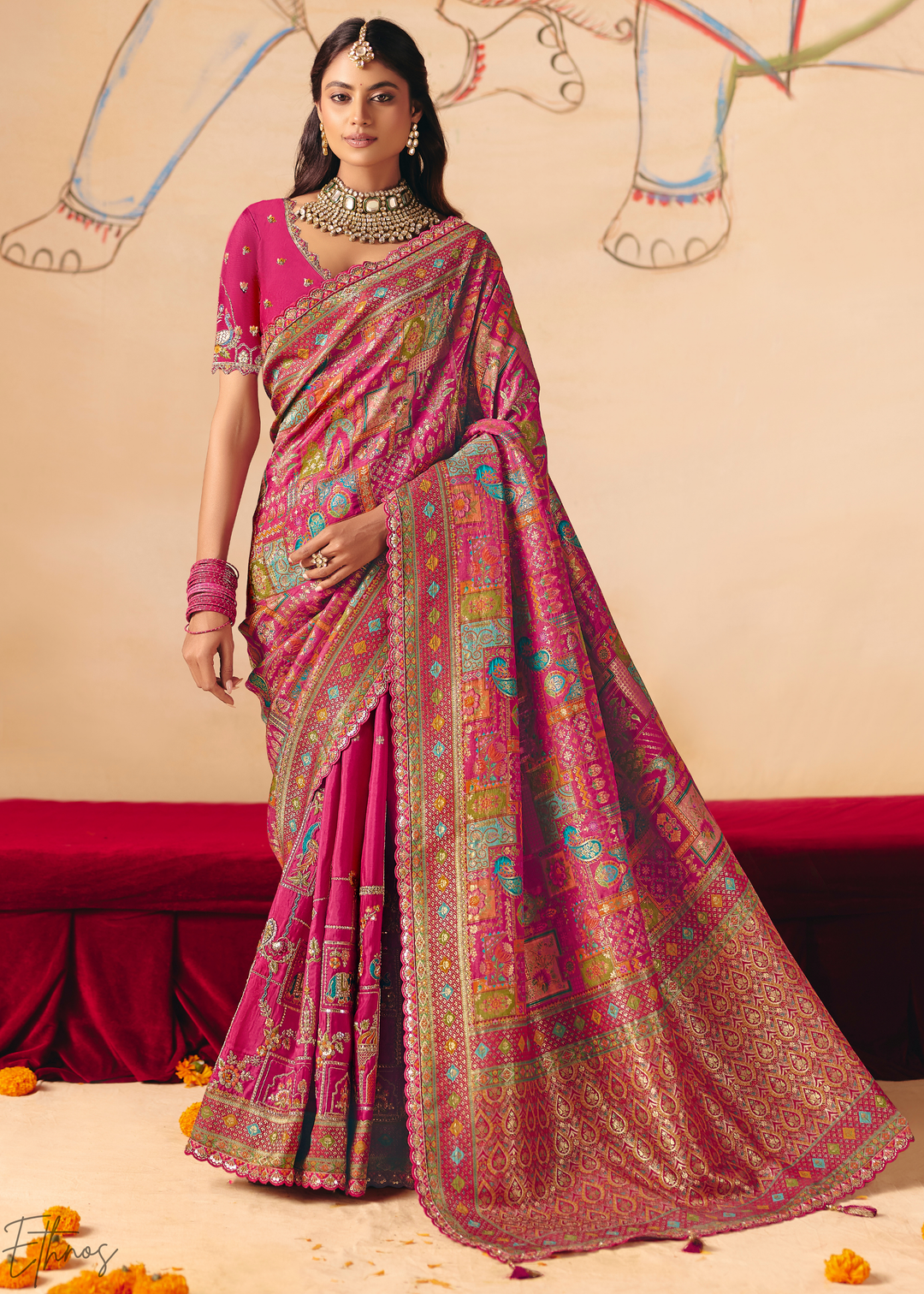 Fuchsia Madhubani Dola Silk Saree
