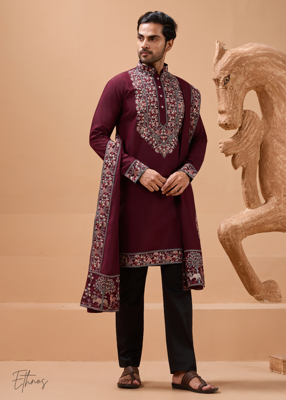 Maroon Mens Wear Silk Kurta With Pant And Dupatta