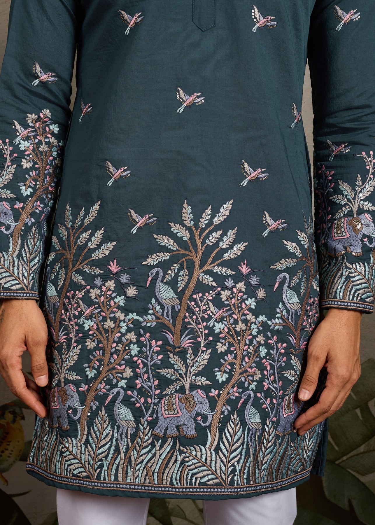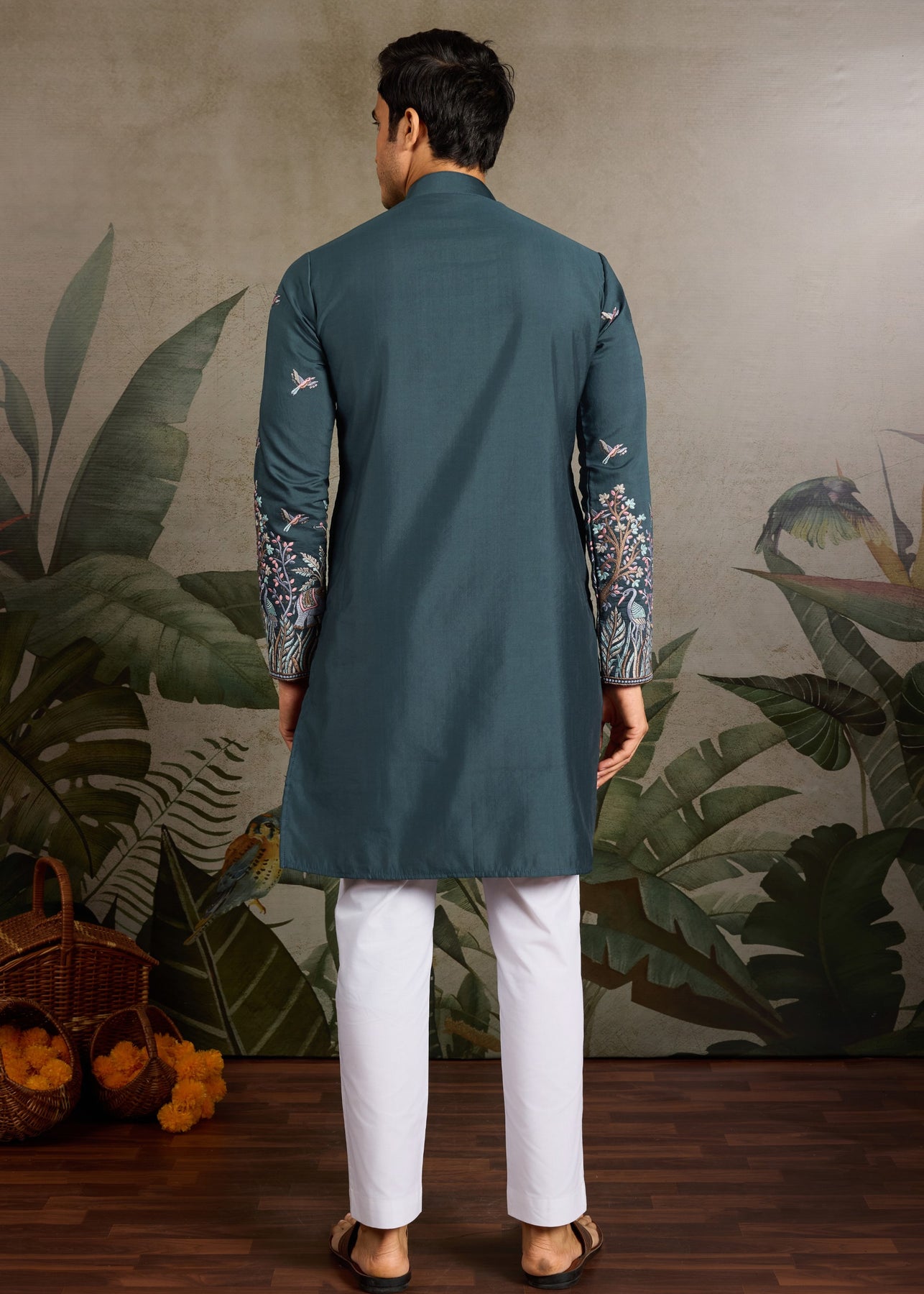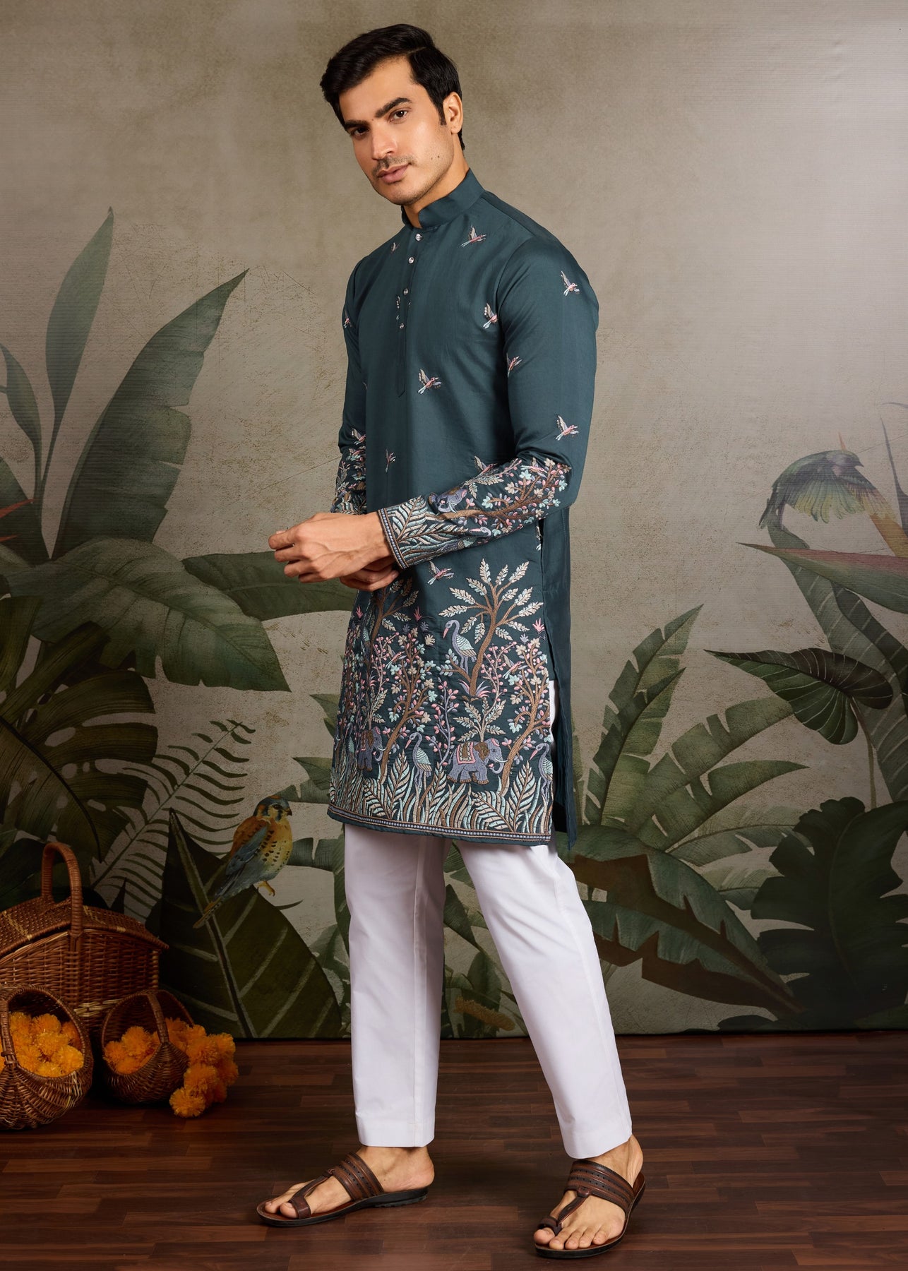 The Deep Teal Green Men’s Silk Kurta with Pant is a well-styled traditional men’s ethnic outfit featuring a rich deep teal green silk-effect fabric in a coordinated kurta + pant set. It offers a straight-cut, knee-length kurta with full sleeves and matching bottoms, and is suitable for festive or semi-formal occasions. Its fabric and colour elevate it beyond everyday wear, while still offering convenience and value.