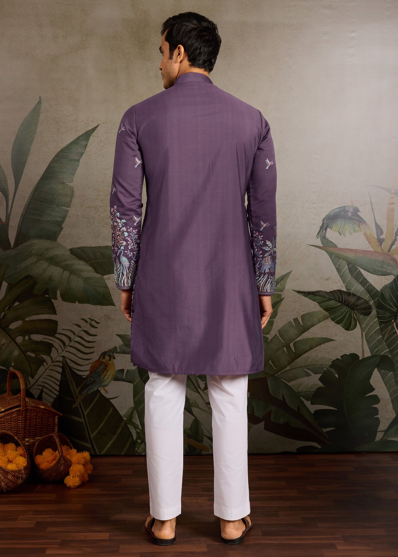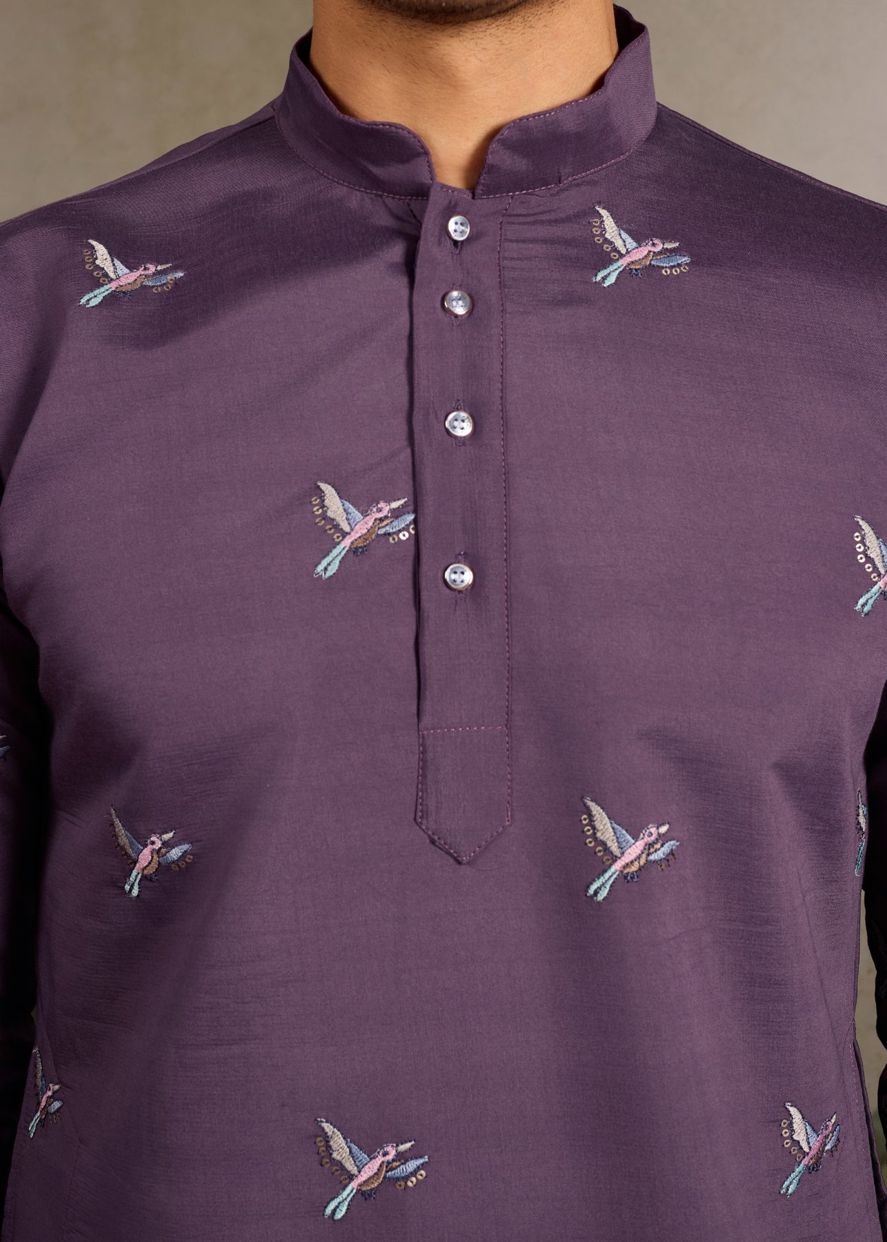 This Dusty Plum Mens Silk Kurta with Pant is a coordinated two-piece set: a full-sleeve kurta (top) paired with a matching pant (bottom). The colour is described as dusty plum — a muted, slightly toned-down purple with a hint of grey or mauve undertone, making it elegant without being overly bright. The set is positioned for men’s ethnic wear occasions, offering a mix of tradition and modern refinement. The kurta is knee-length (as per the specs) and has a straight cut.