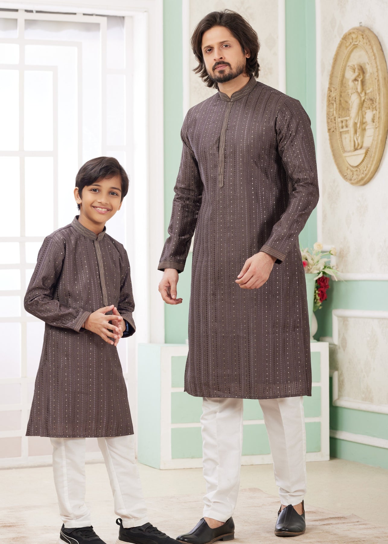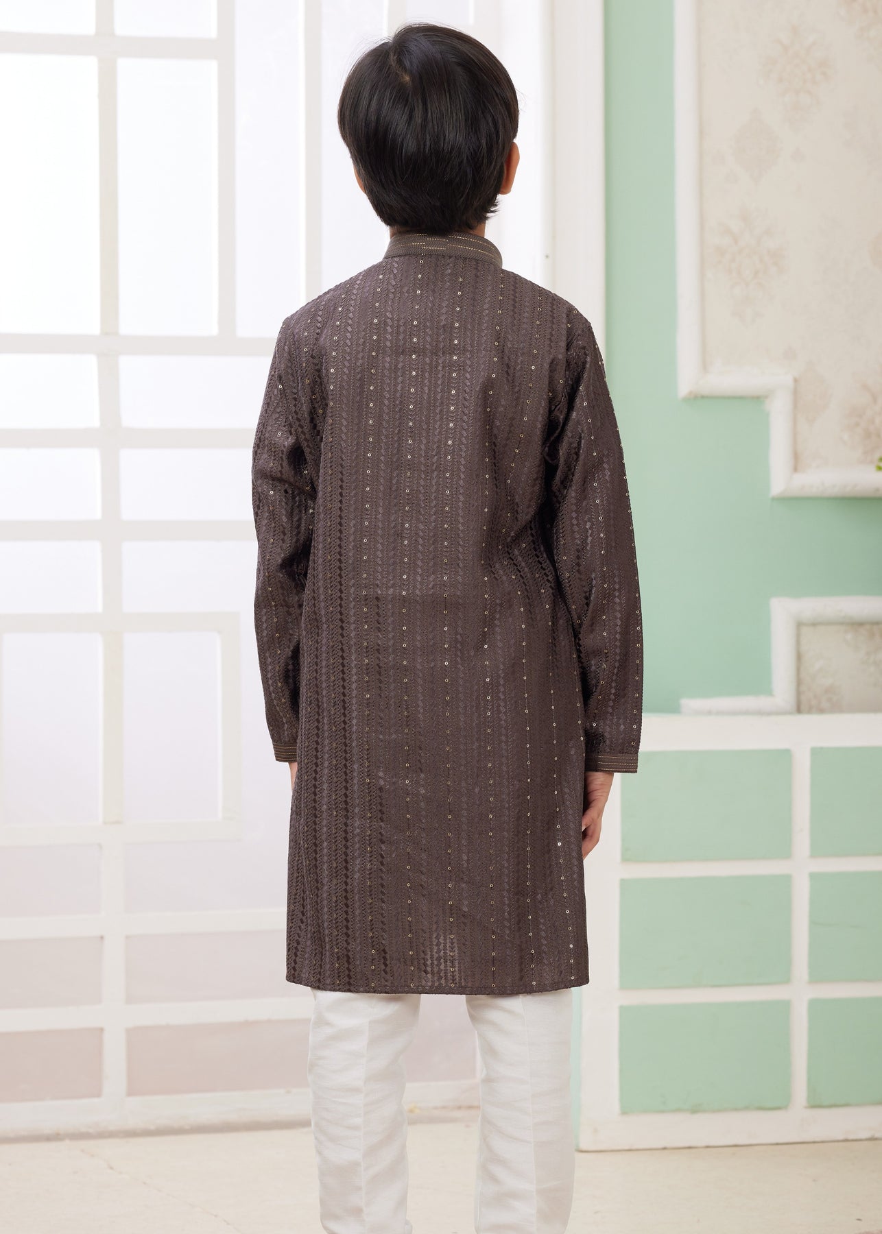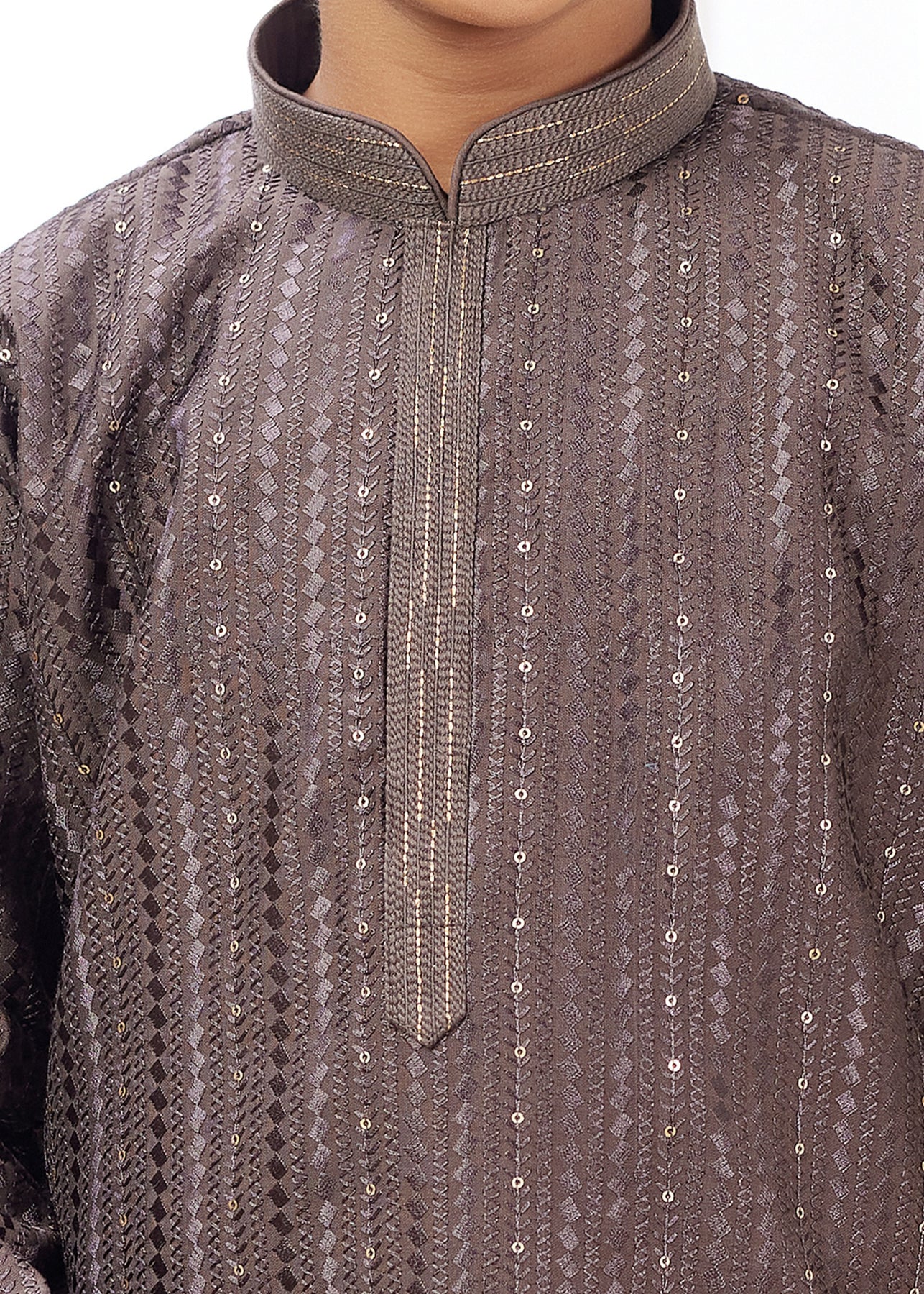 Mocha Brown Silk Mens Kurta Set With Thread Embroidery Work