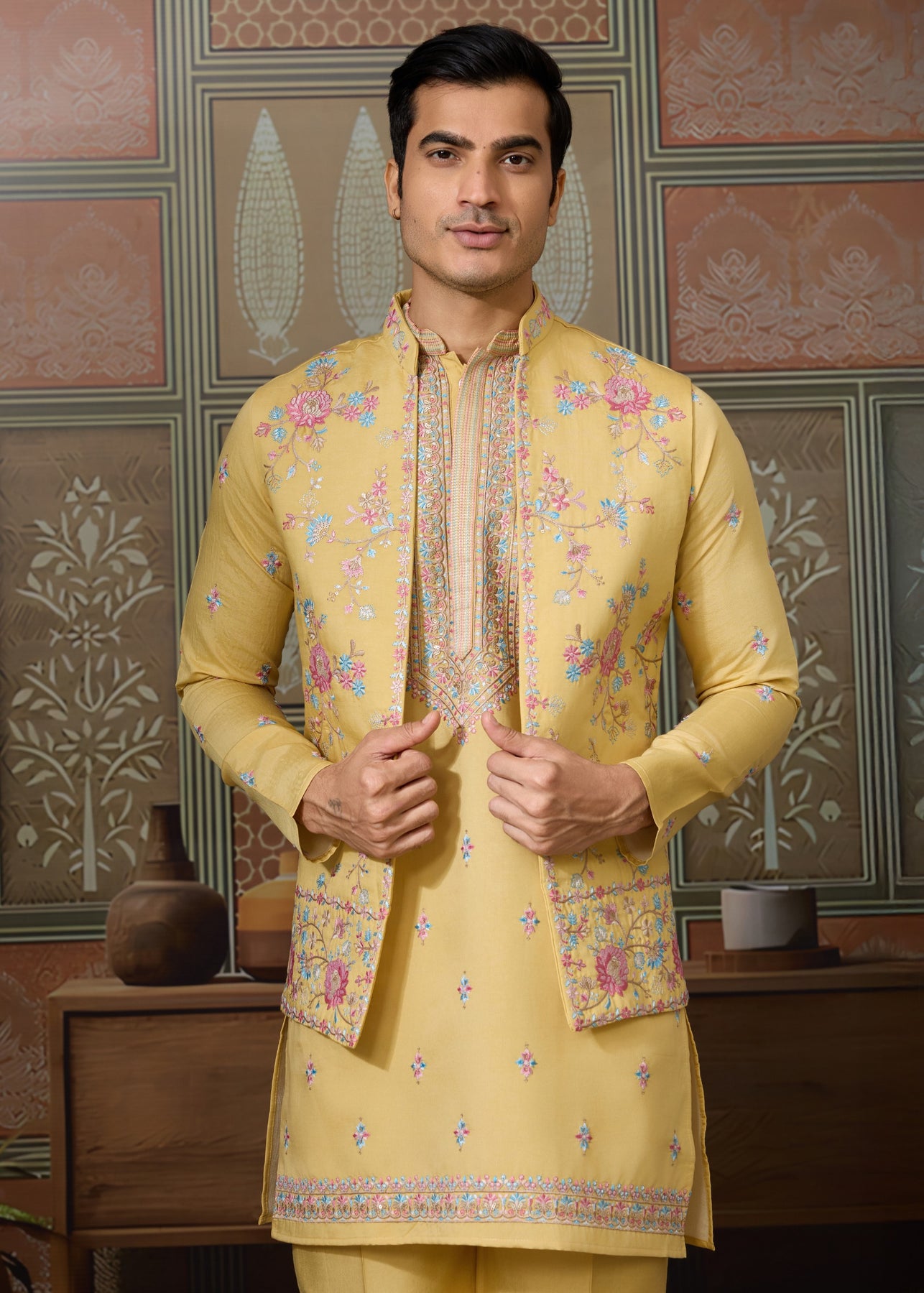 Mustard Yellow Mens Wear Koti Style with Silk Kurta and Pajama