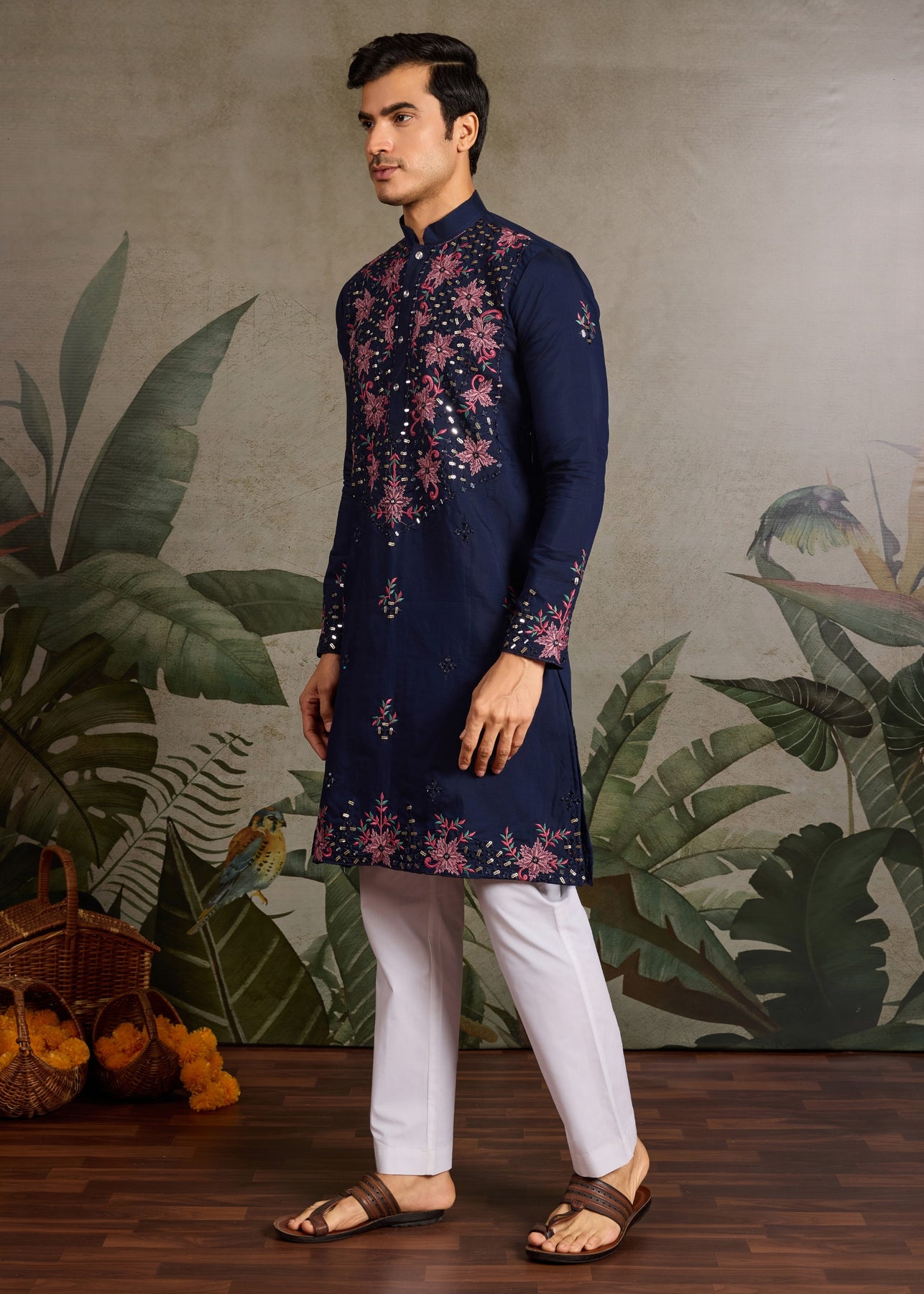 A striking navy blue silk kurta paired with crisp white pants, this ensemble offers a blend of sophistication and traditional elegance. It is intended as ethnic / festive wear for men who want to make a refined statement at weddings, celebrations, or cultural events.