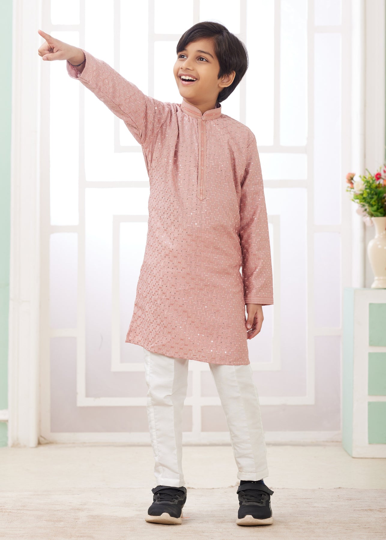 A peach‑silk ensemble, this set features a finely tailored kurta adorned with elegant thread embroidery woven across the yoke and placket. The soft, mandarined collar and full sleeves give it subtle sophistication. It's paired with matching silk pants for a seamless, monochromatic look—perfect for weddings, festive events, or celebratory gatherings. The lightweight, smooth-luster silk fabric drapes beautifully, combining comfort with a graceful, polished finish.