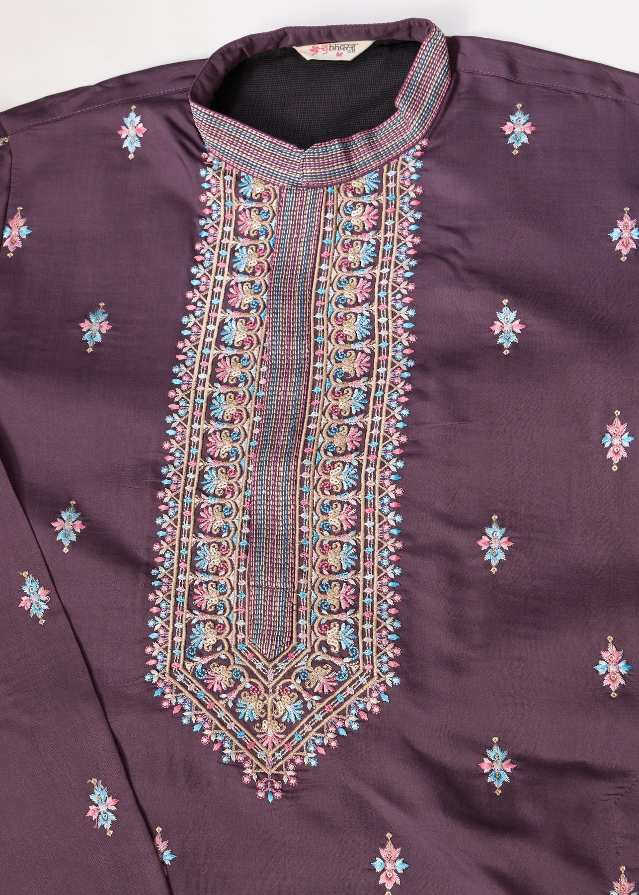 Step into regal elegance with this Purple Koti-style kurta set, meticulously crafted to blend tradition with modern flair. This three-piece ensemble includes a silk kurta, matching pajama, and a coordinating koti (jacket/waistcoat) piece to add depth and structure.