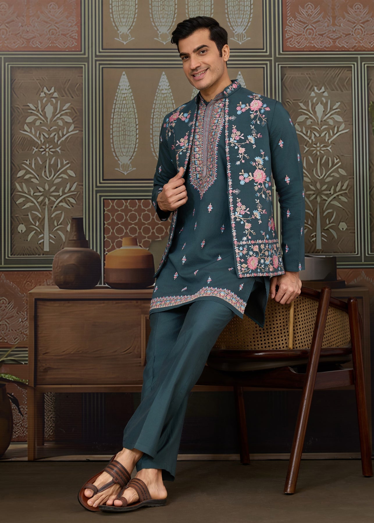 Elevate your festive wardrobe with this Rama Green Koti Style Men’s Kurta Pajama Set, a masterpiece of traditional craftsmanship blended with modern elegance. Designed for the man who appreciates refined style, this ensemble embodies luxury, grace, and comfort in every stitch. This attire transitions seamlessly from traditional rituals to evening celebrations, ensuring you look effortlessly graceful throughout. Whether you’re the groom, a groomsman, or a guest, this outfit ensures you make an impression that’s timeless and stylish.