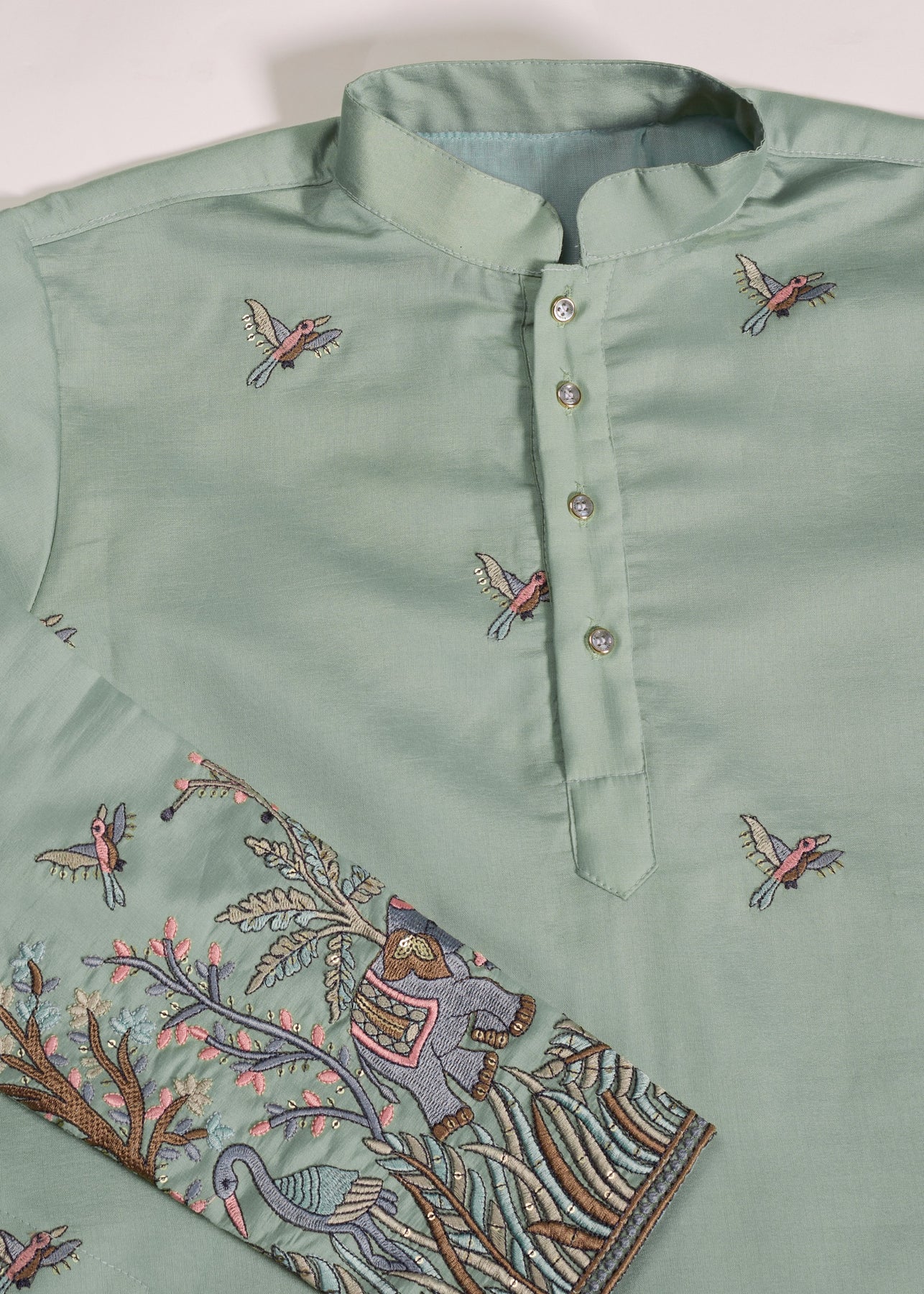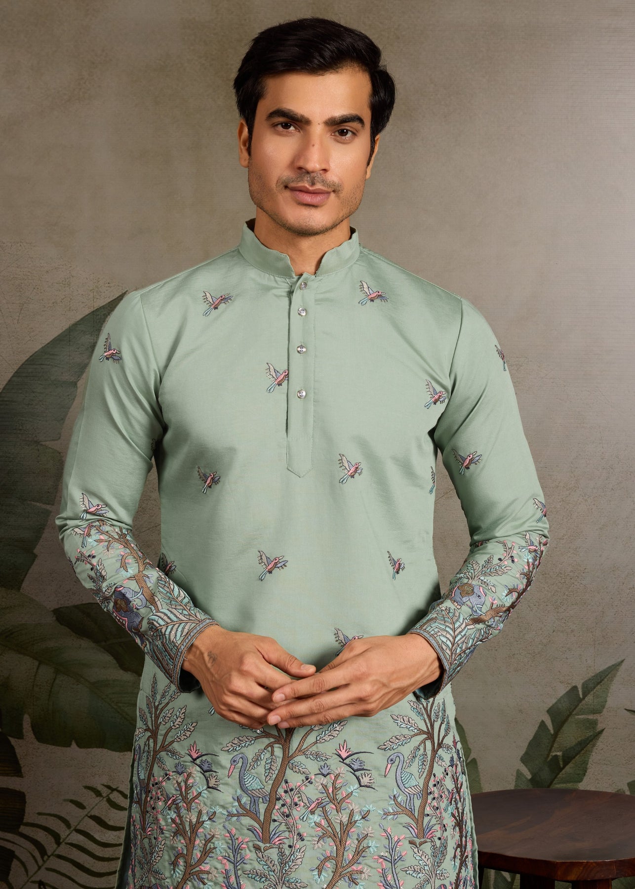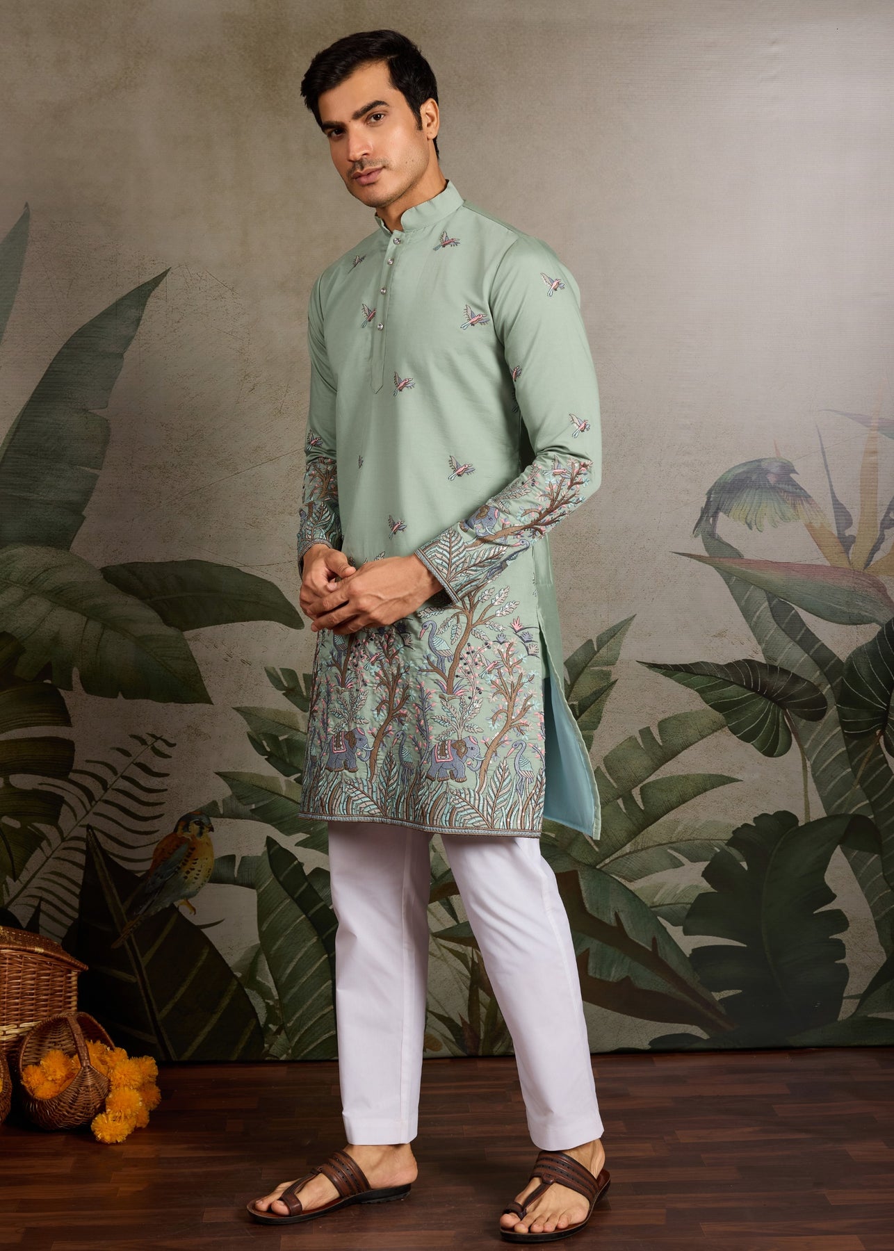 This Sage Green Mens Silk Kurta with Pant ensemble bridges classic Indian tradition with understated sophistication. Rendered in a serene sage green hue, the kurta-pant set exudes quiet elegance—ideal for wedding ceremonies, festive gatherings, formal ethnic events, and evening soirées. The softness and sheen of silk bring a luxurious touch, while the straight silhouette and matching pants make for a coordinated look.