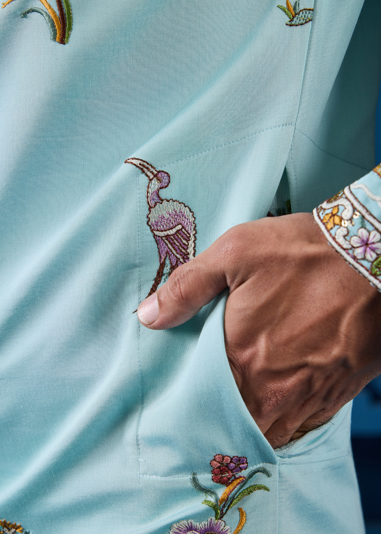 The Seafoam Blue Kurta Set stands out for its calming colour palette — the shade sits beautifully between mint and pastel teal, making it flattering on most skin tones and perfect for daytime celebrations. The kurta’s fabric has a silky, fluid fall, giving it a graceful movement with every step. It catches light subtly, adding a refined glow without appearing overly shiny. Its minimalist design makes it highly versatile — you can dress it up with a stole or brooch for weddings, or wear it as-is for pooja ceremonies, family gatherings, or festive dinners.