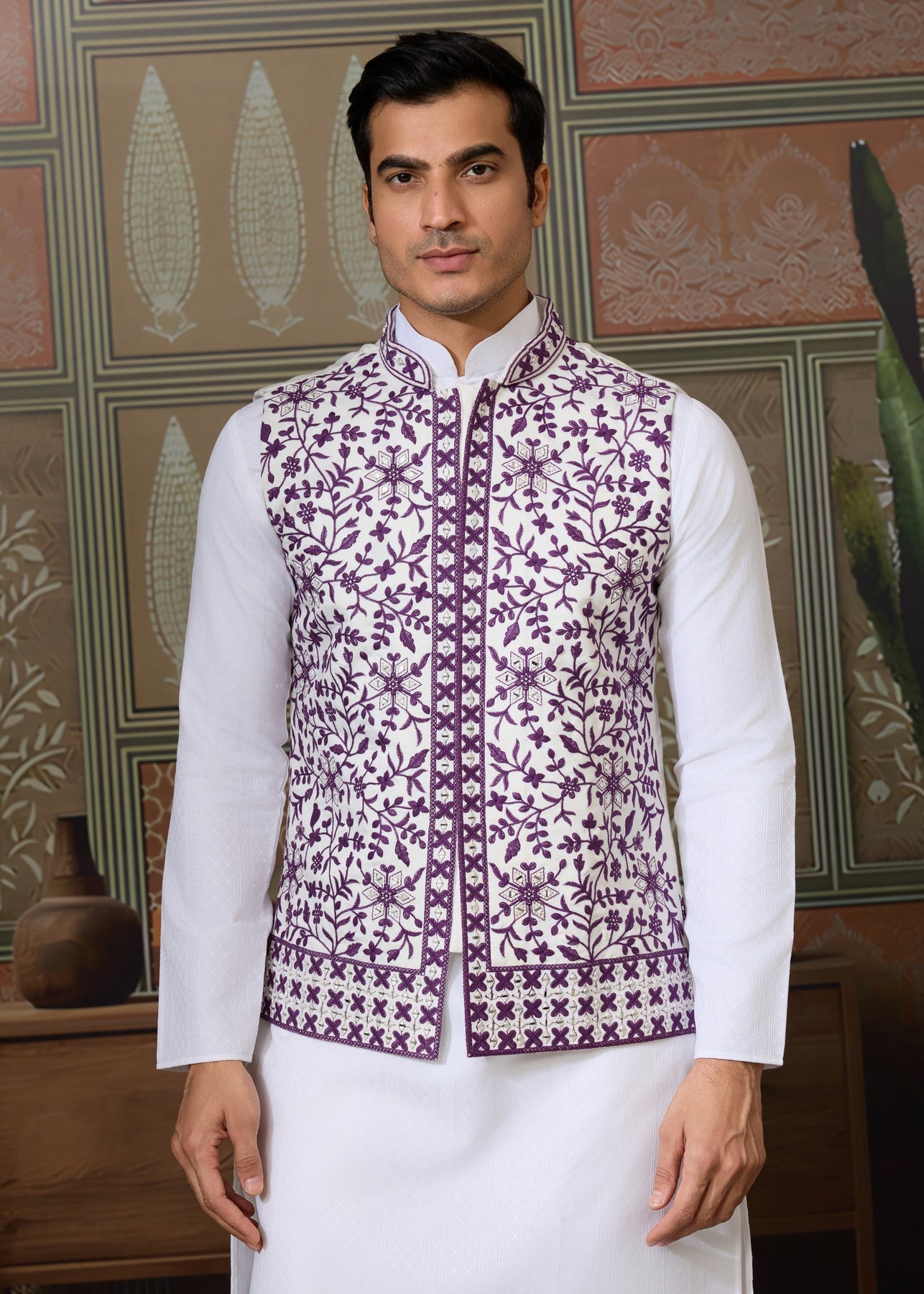 Elevate your ethnic wardrobe with this White Kurta and Pant Set paired with a Deep Plum and White Embroidered Nehru Jacket — a timeless combination of sophistication, craftsmanship, and tradition. A perfect blend of traditional aesthetics and modern elegance, this ensemble embodies the essence of contemporary Indian fashion: refined, regal, and effortlessly stylish.