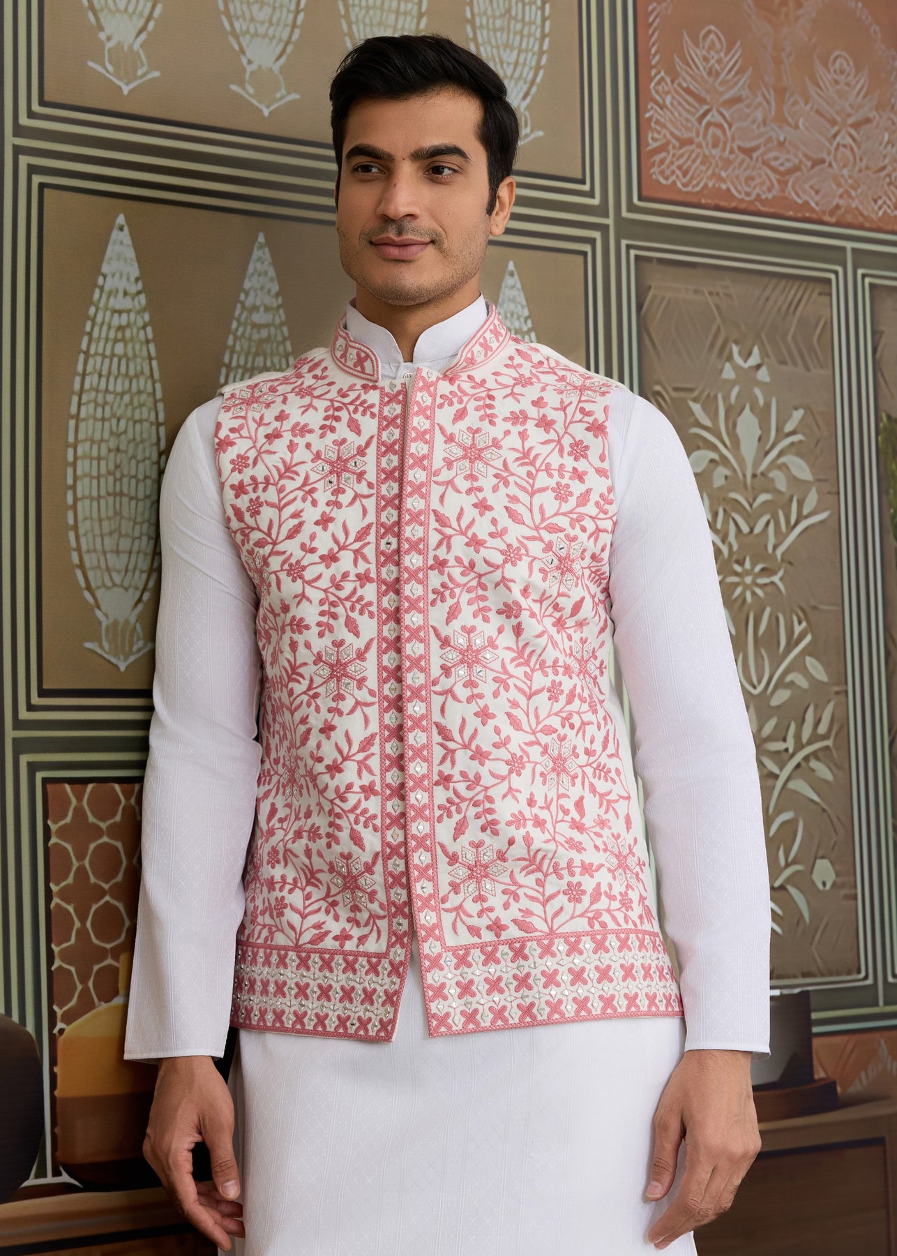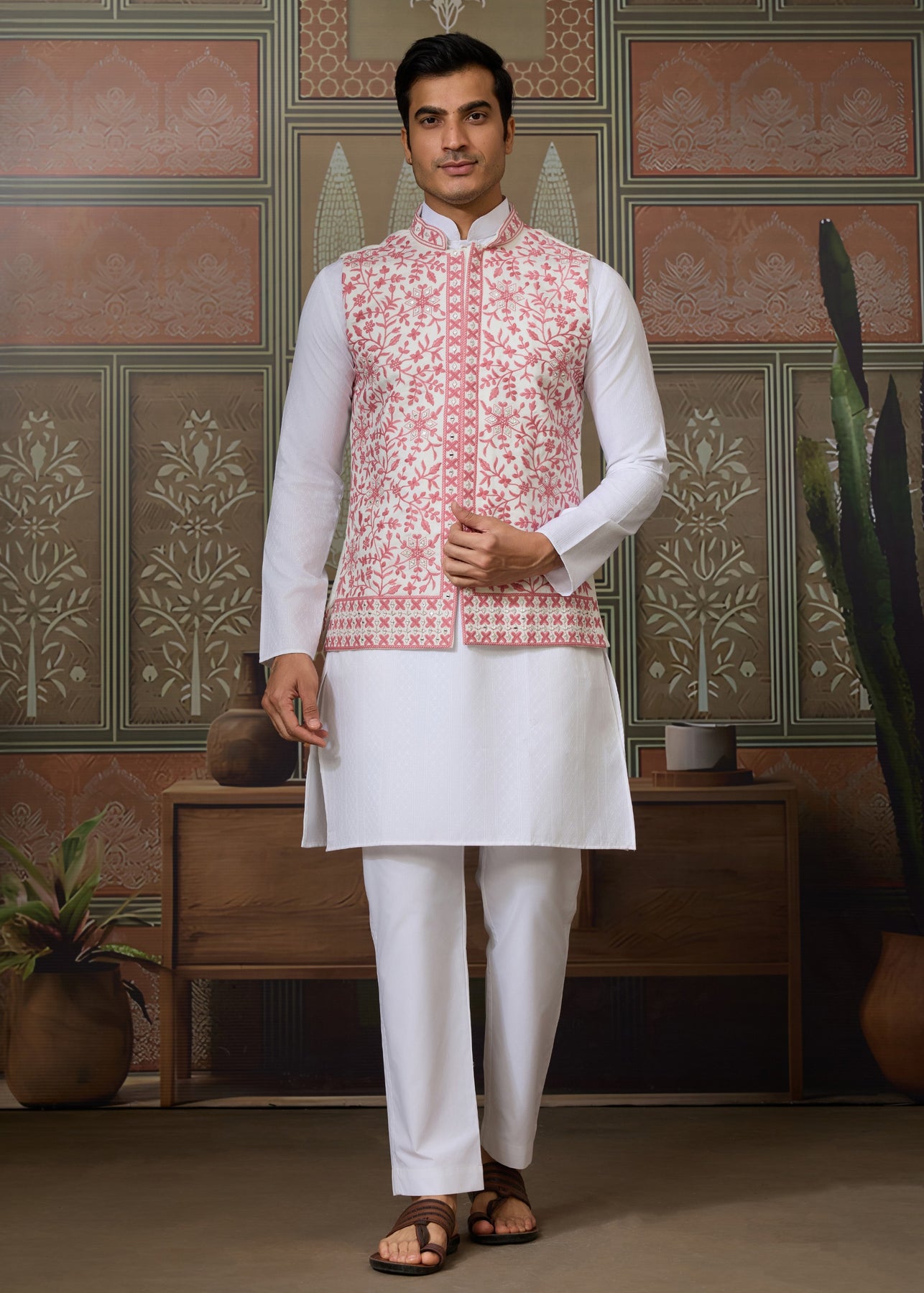 White Kurta And Pant With A Pink And White Embroidered Nehru Jacket