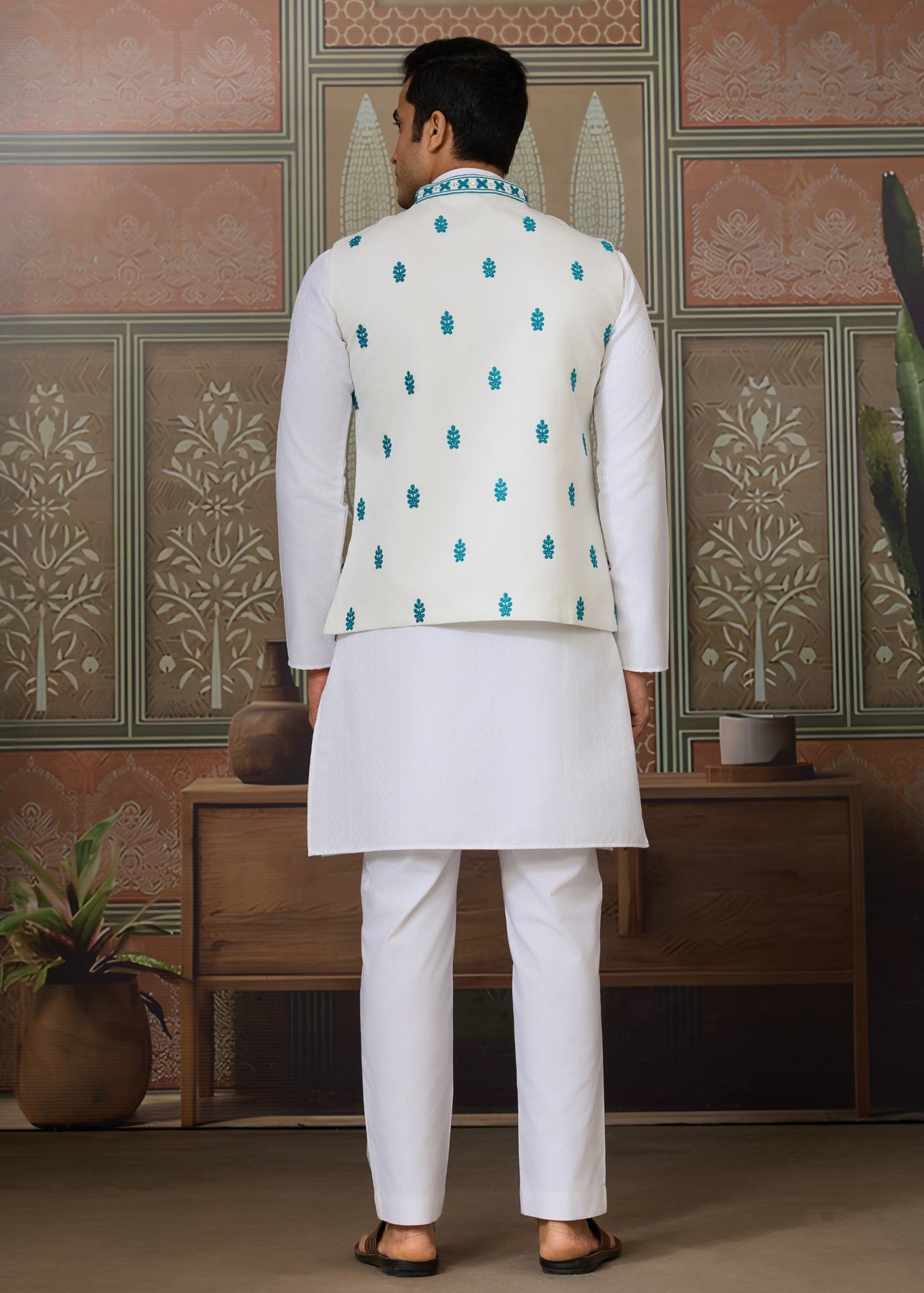 Elevate your festive and formal wardrobe with this sophisticated three-piece ensemble, thoughtfully curated for men who value elegance, comfort, and craftsmanship. The set features a pristine white viscose-silk kurta and pant, paired with a powdered blue embroidered Nehru jacket that adds a refined touch of colour and artistry.