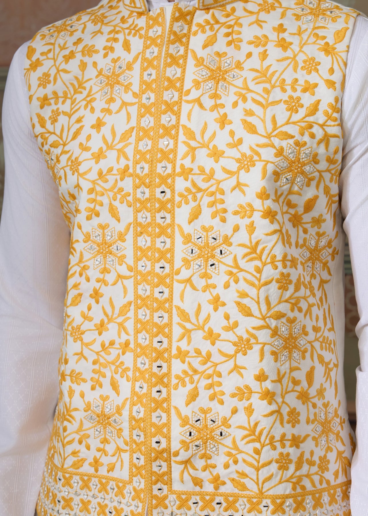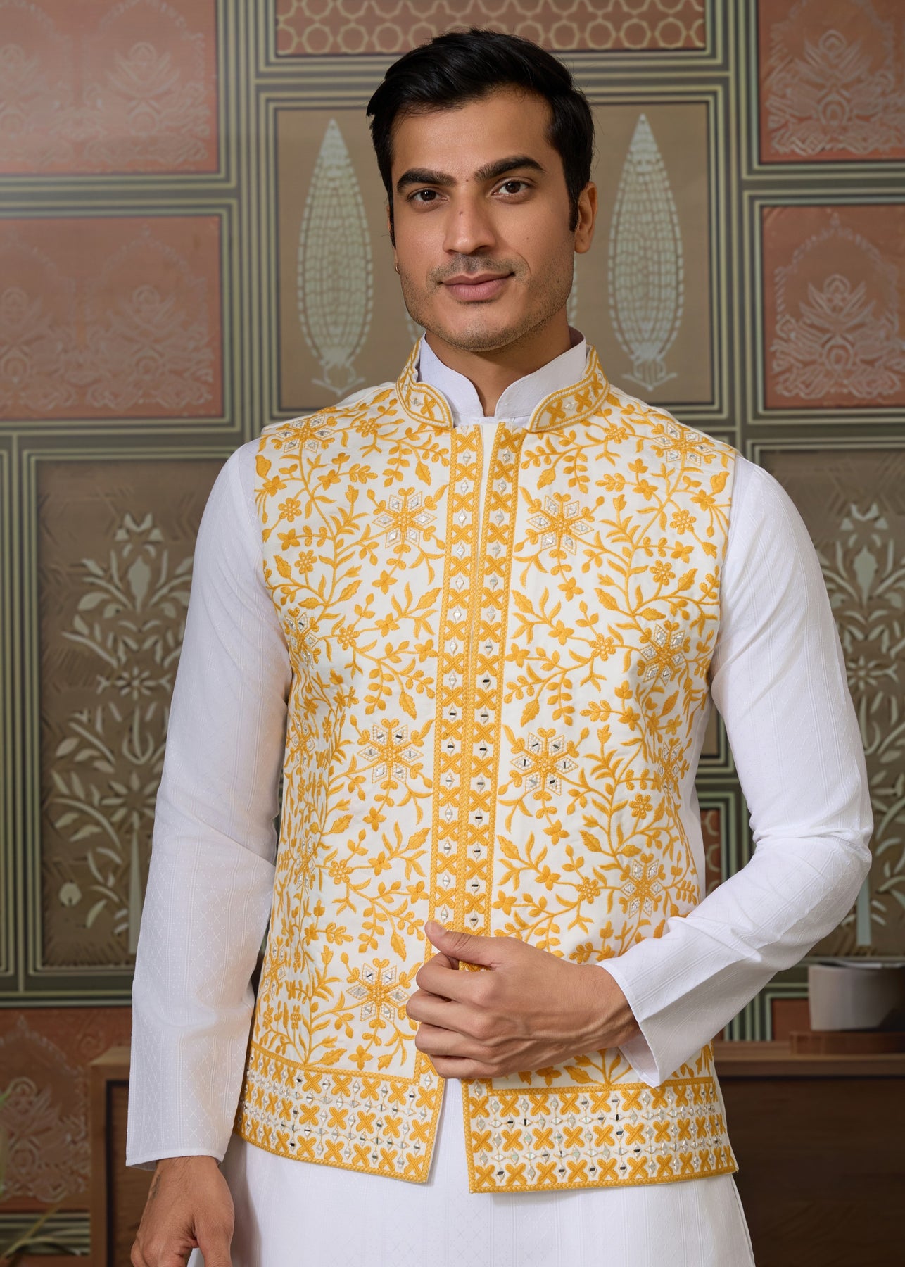 White Kurta And Pant With Sunflower Yellow Embroidered Nehru Jacket