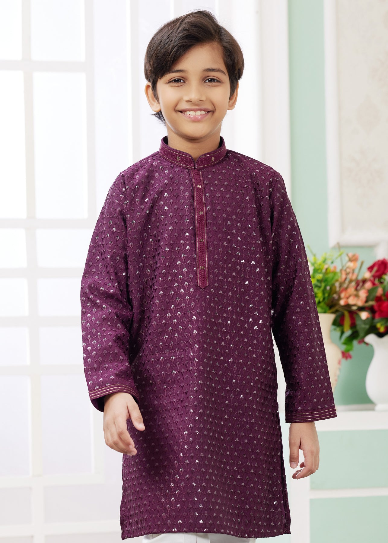 Elegant wine-purple silk kurta with intricate thread embroidery and shimmering mirror accents, radiating festive charm and sophistication. Features a classy mandarin (band) collar and front open jacket layered over a coordinating inner kurta.