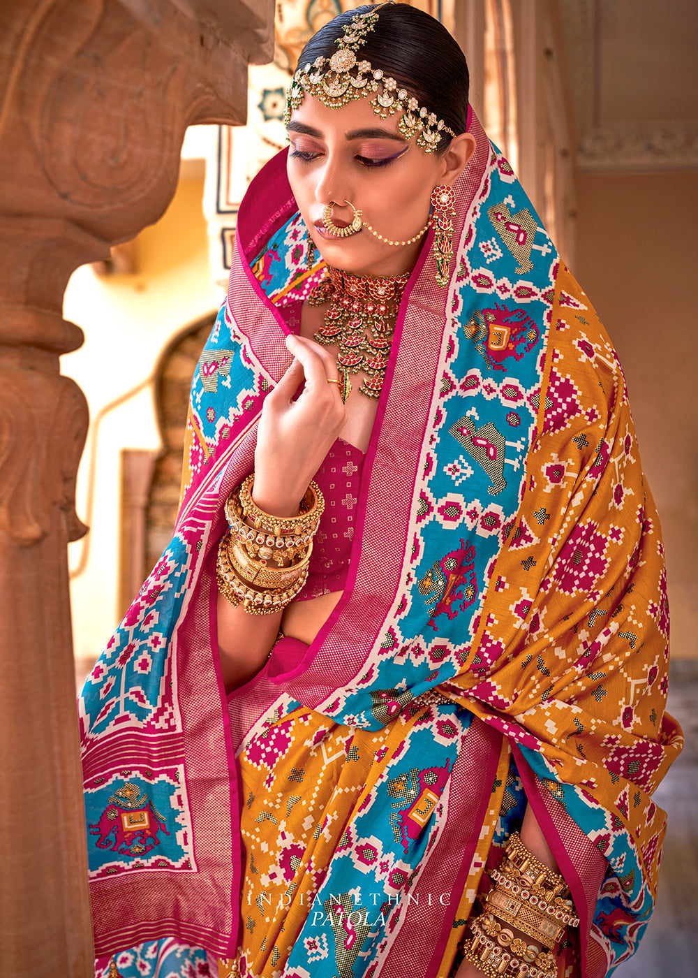 Pink & Light Yellow Patola Printed Tissue Silk Saree with Designer Blouse