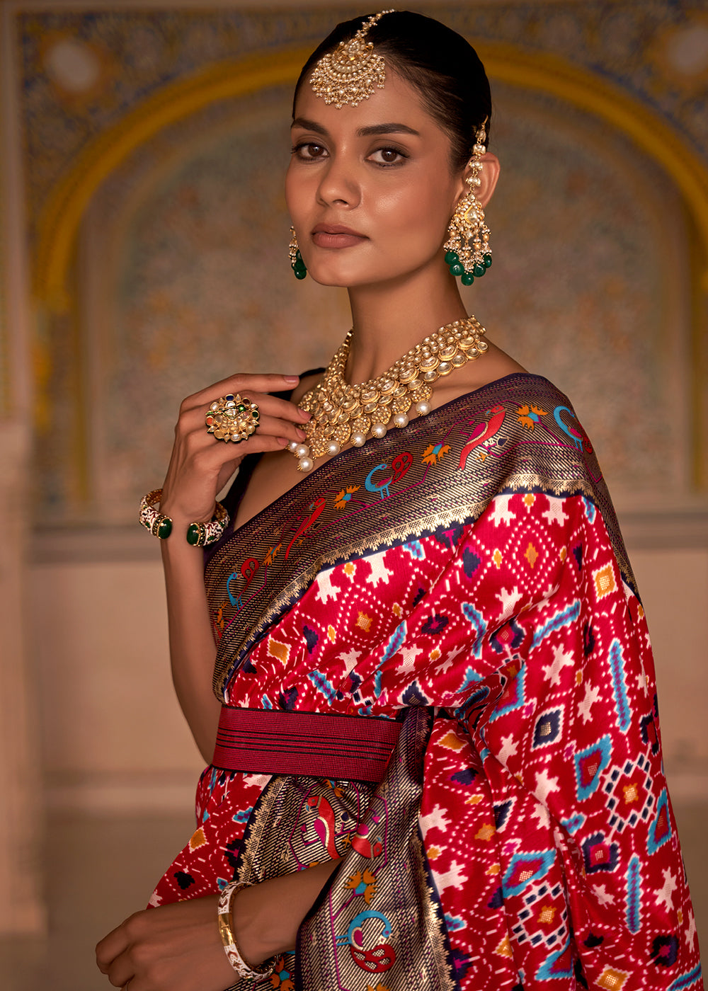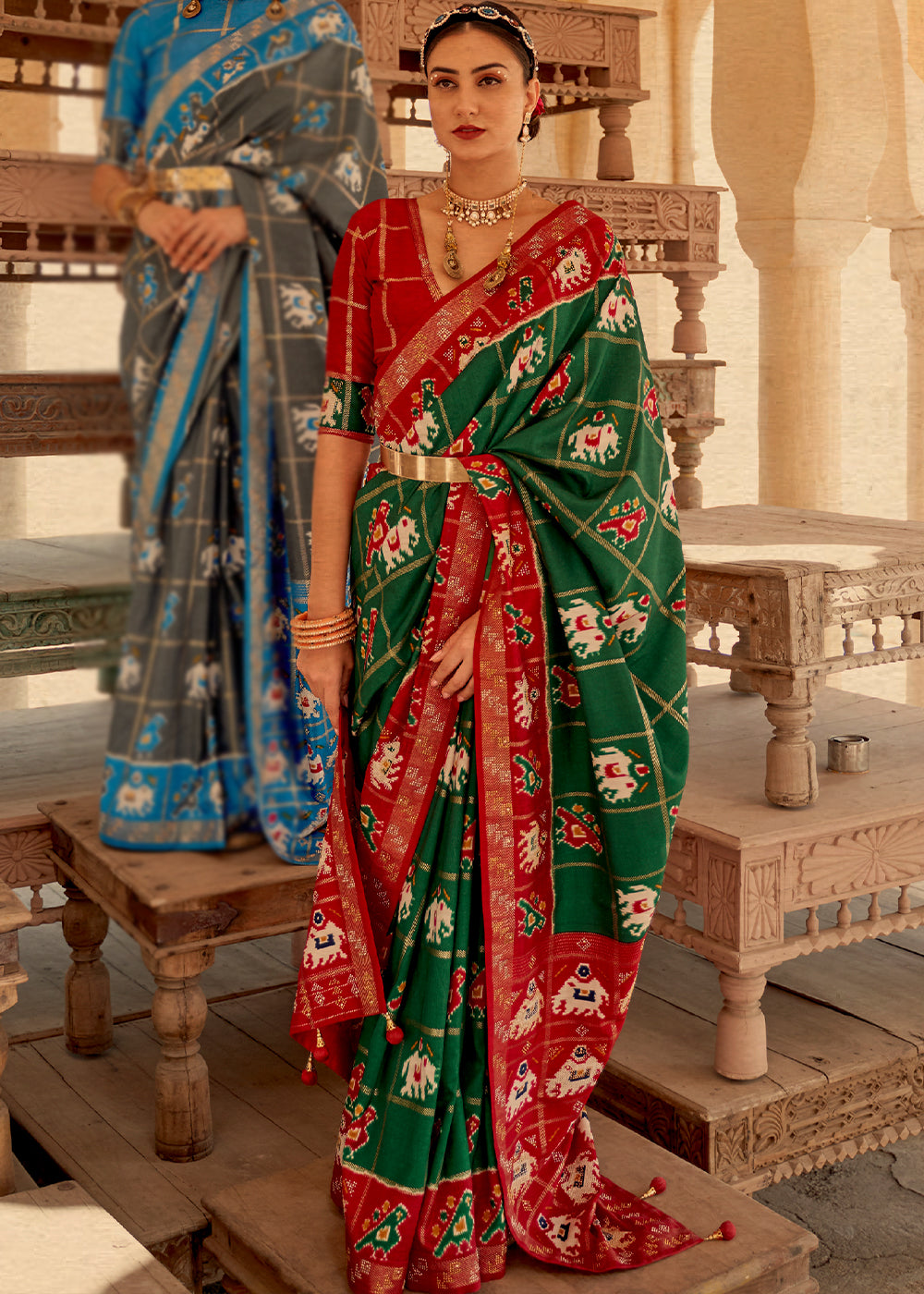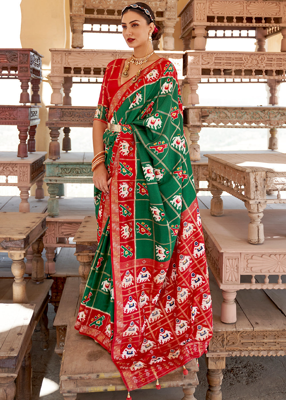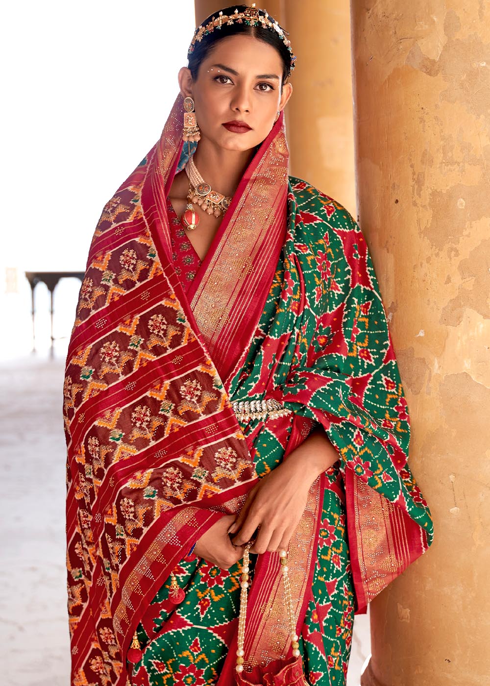 Red & Green Printed Patola Tussar Silk Saree