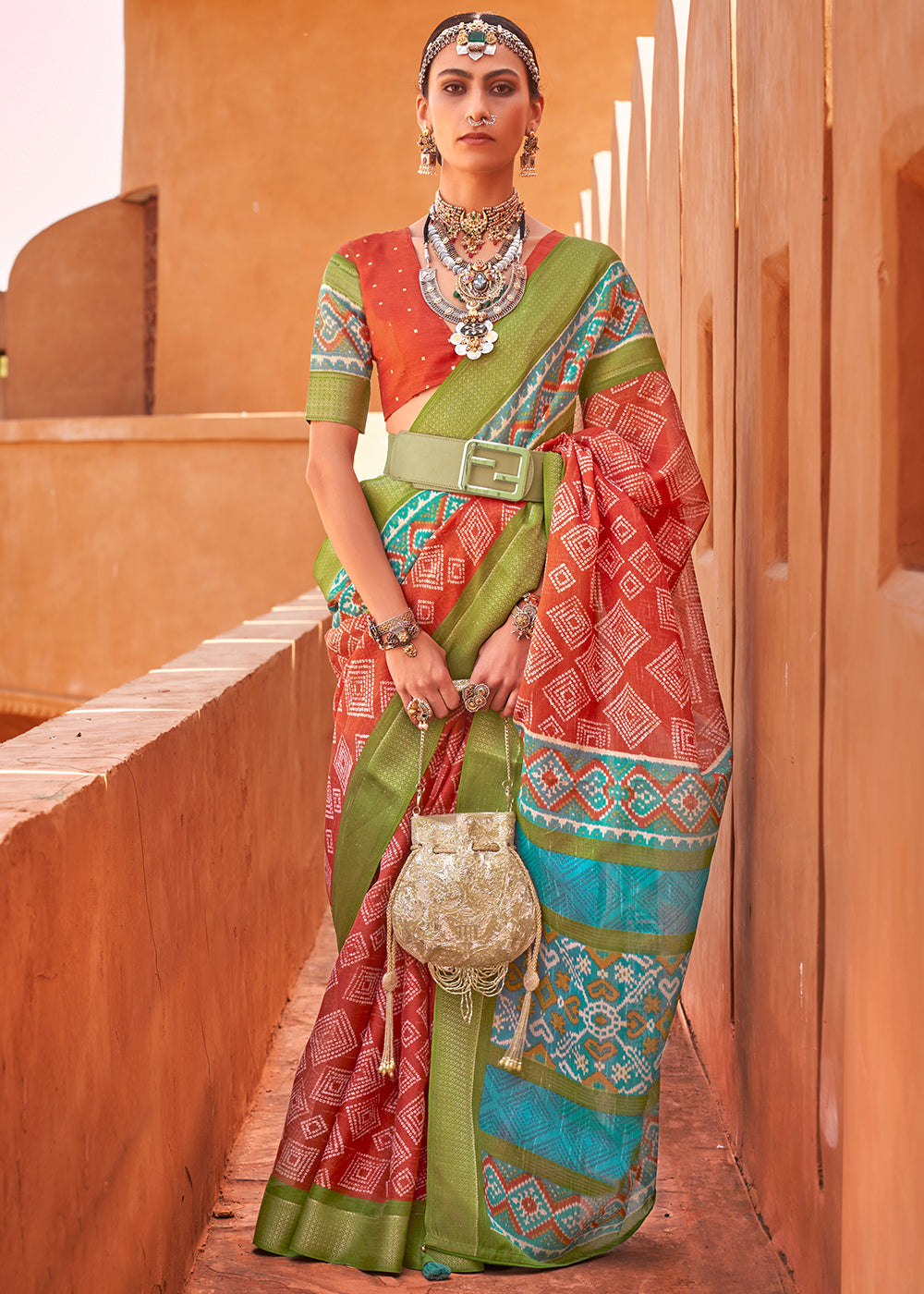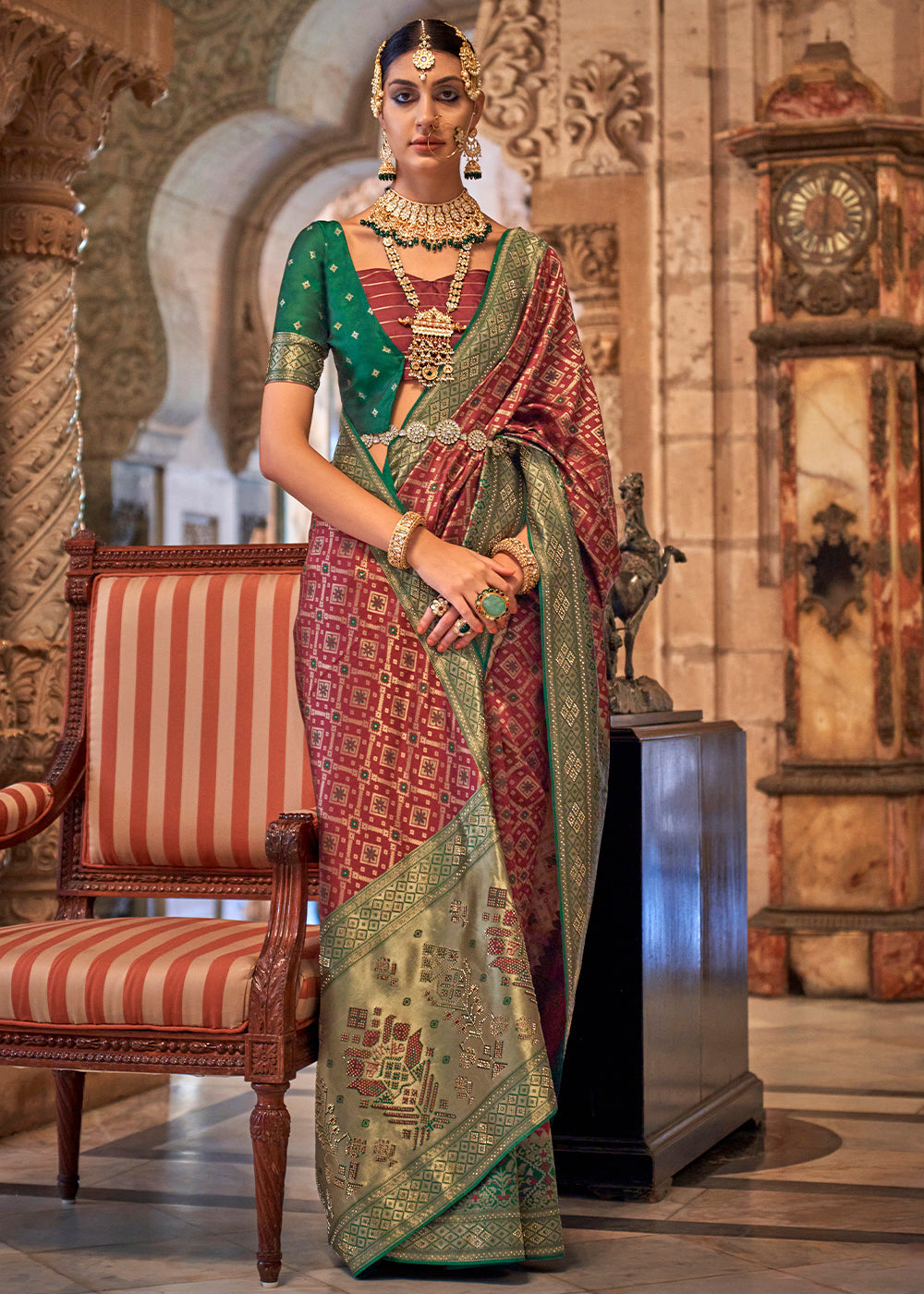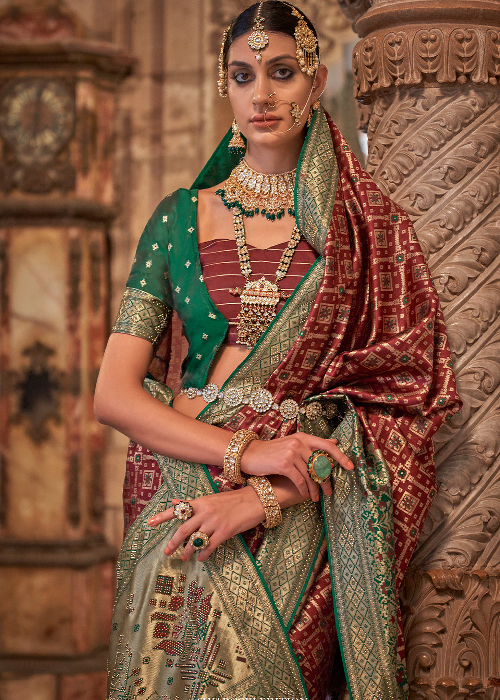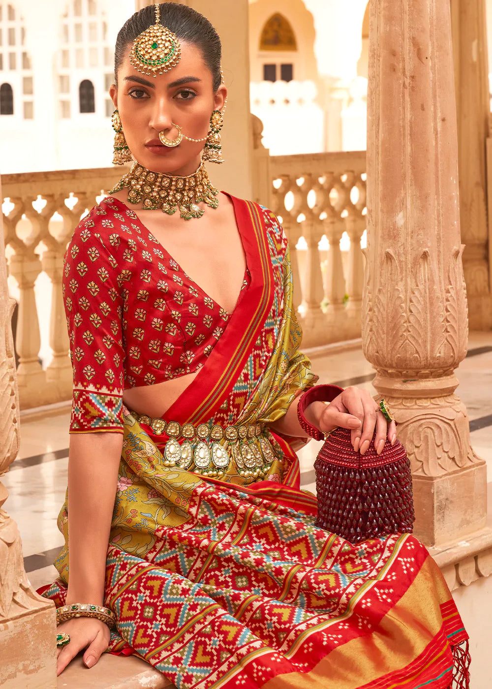 Red & Green Printed Patola Tussar Silk Saree