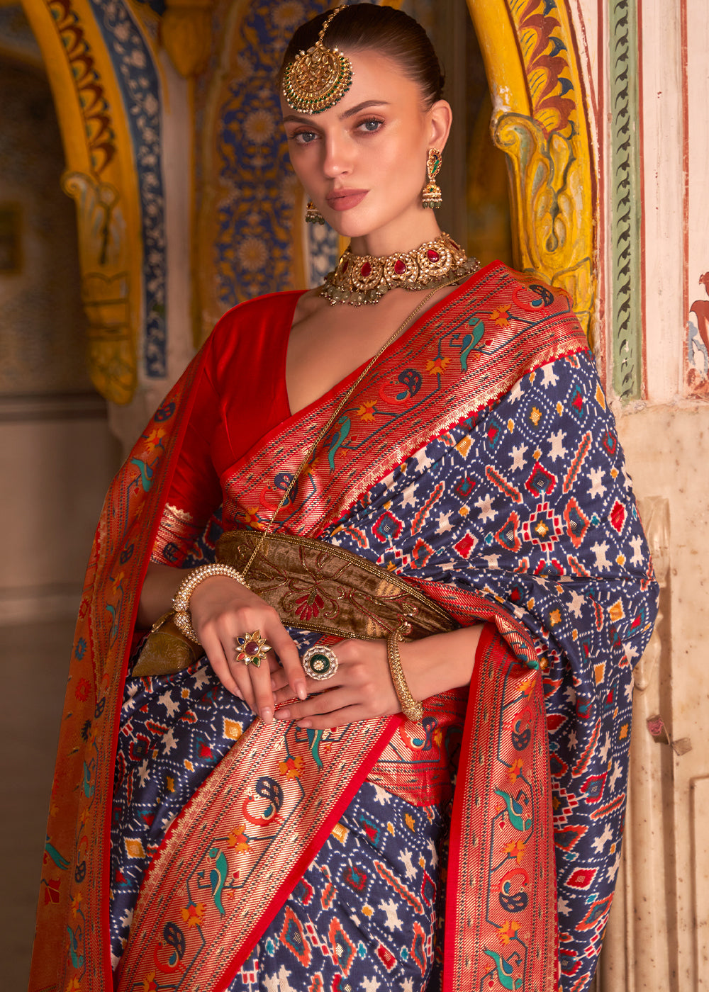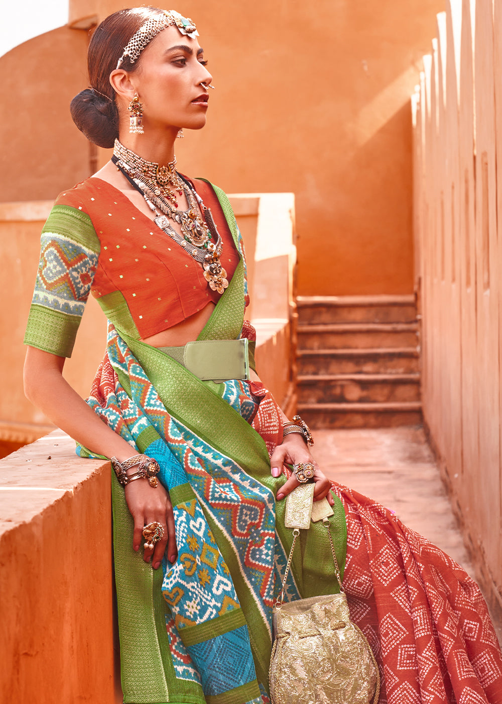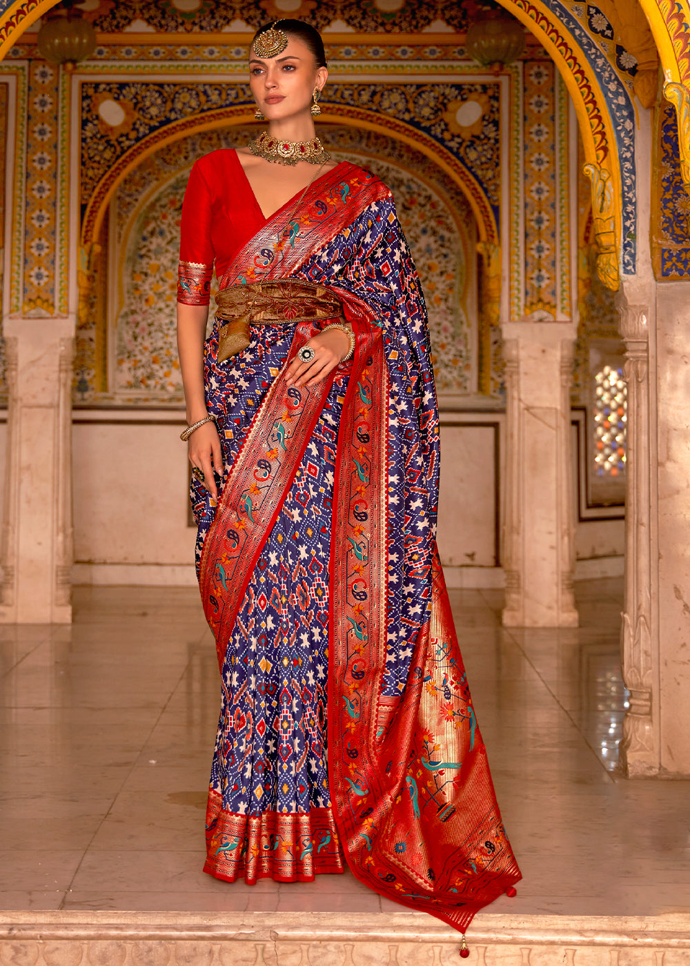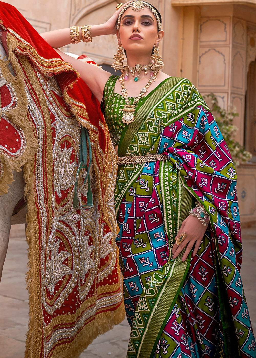 Red & Green Printed Patola Tussar Silk Saree