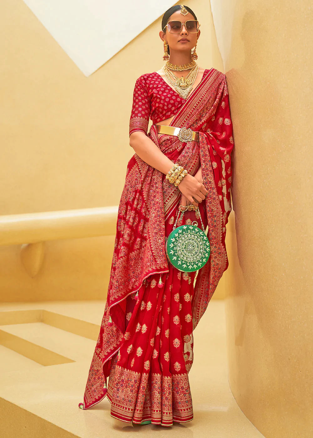 Venetian Red Banarasi Jacquard Silk Saree with Swarvoski work