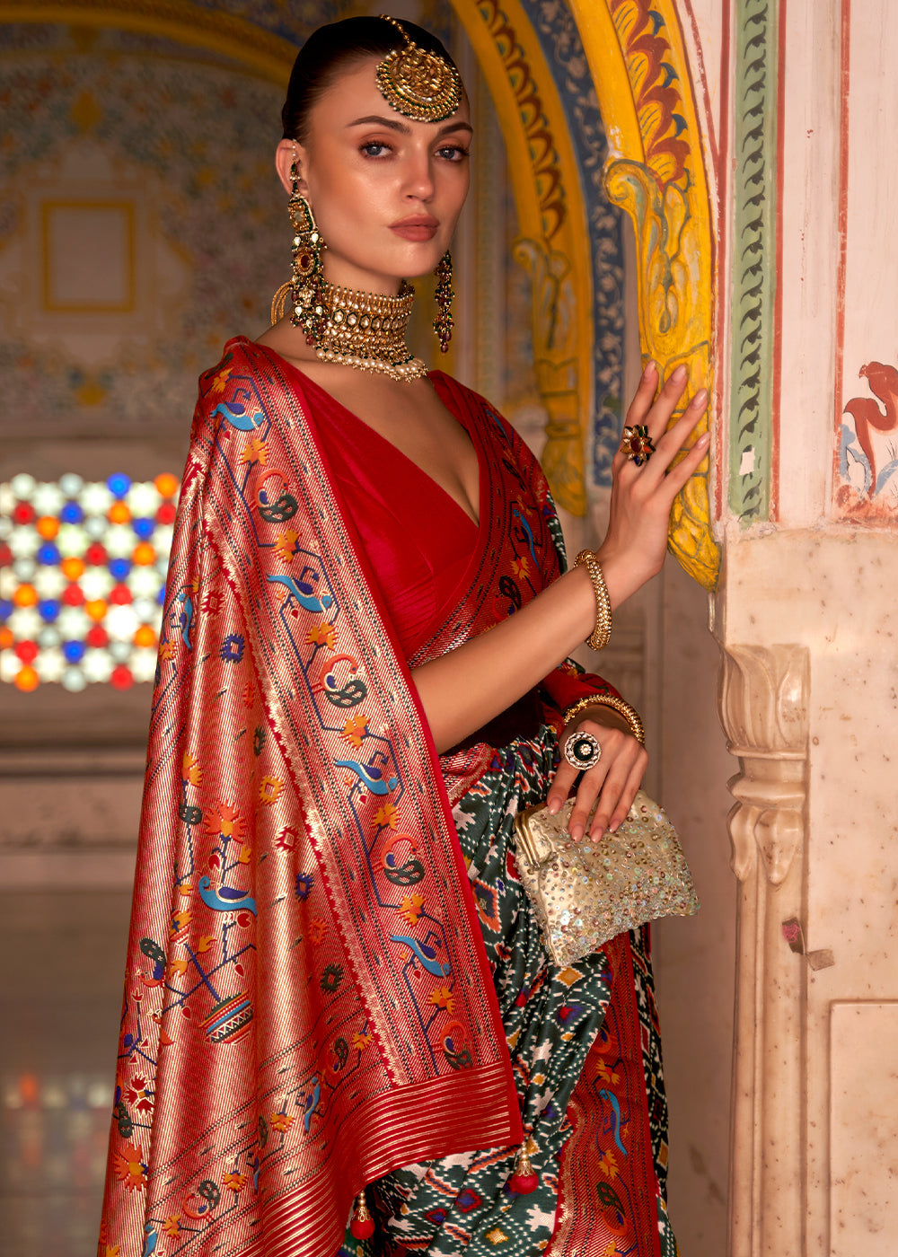 Green & Red Paithani Printed Silk Saree