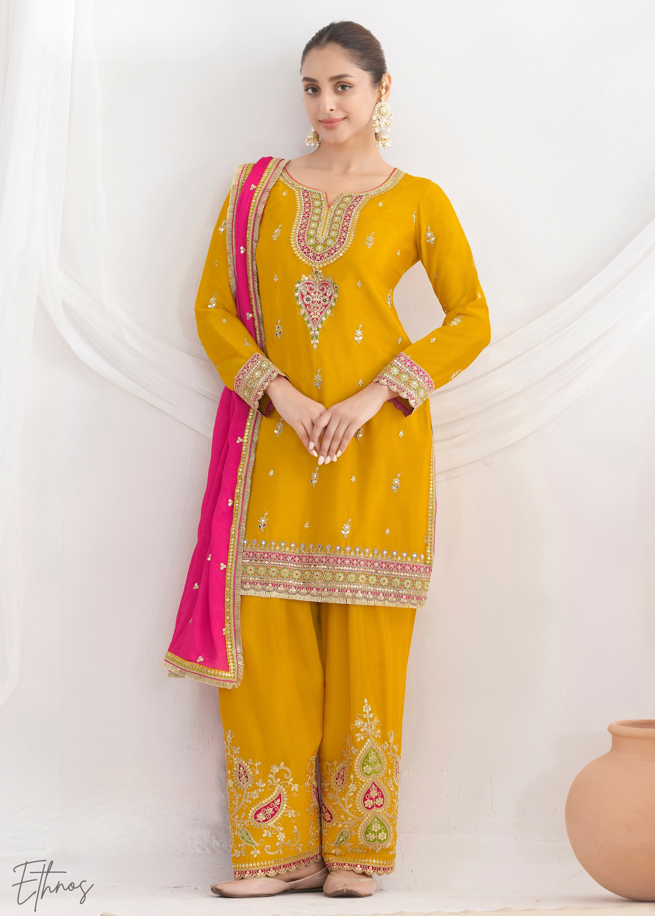 This dandelion yellow chinnon silk salwar suit blends vibrant color with elegant golden embroidery, creating a stunning festive look. Crafted from premium chinnon silk, the top, bottom, and dupatta offer a luxurious feel with graceful drape. The radiant pink shade adds energy and charm, making it perfect for weddings, parties, and cultural celebrations. Stylish yet comfortable, this outfit beautifully combines traditional elegance with modern appeal.